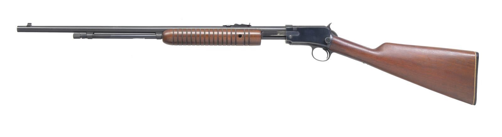 RIFLES. 1) WINCHESTER MODEL 62 PUMP. Cal. 22 S, L, LR. S# 186804. Bbl. 23" rnd. w/ original sporting sights. Tubular mag. Lg. rnd. grooved forearm & straight grip walnut stock w/ plastic buttplate & added white line spacer. CONDITION: over 90% original blue. Wood shows scattered scratches & marks. 1 Forend screw is missing. Bore is bright w/ strong rifling showing a few sm. spots. (19-5449/DS). CURIO. 2) REMINGTON MODEL 14 PUMP. Cal. 35 Rem. S# 103934. Bbl. 22" rnd. Ramp mounted bead front sight, filler in rear dovetail w/ Lyman tang sight. Tubular mag. Grooved walnut forearm & pistol grip stock w/ grooved steel buttplate. CONDITION: 80% lightly worn blue showing scratches & marks. Forearm has lightly worn finish showing marks. Stock is heavily sanded & refinished. Bore is bright w/ sharp rifling. (19-5456/DS). CURIO. 3) MARLIN GLENFIELD MODEL 75 AUTOLOADING RIFLE. Cal. 22 LR. S# 70237082. Bbl. 18" rnd. w/ band mounted blade front sight & elevator adj. sporting rear sight. Glenfield 4x gloss finished scope w/ standard crosshairs on tip off mts. Tubular mag. Band fastened carbine style hardwood stock w/ plastic buttplate & sling swivels. CONDITION: over 90% metal finish w/ bbl. showing spots of freckling. Stock has good original finish showing sm. marks. Bright bore w/ sound Micro-groove rifling. Scope has clear optics. (19-5481/DS). MODERN. $650-1,000.
