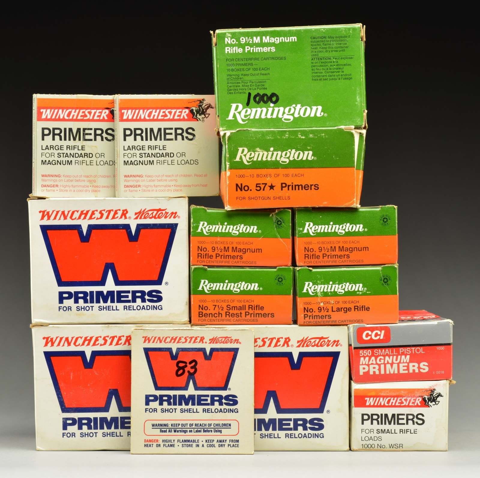 REMINGTON: 500+ (6 BOXES) of No. 57. / 900+ (1 BRICK) of No. 7 1/2 small rifle bench rest. / 1,000 (1 BRICK) of No. 9 1/2 large rifle. / 2500+ (3 BRICKS) of No. 9 1/2M Magnum rifle. /