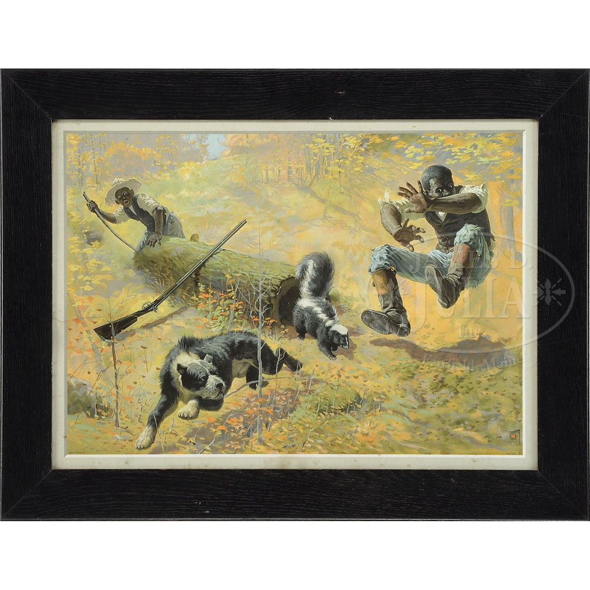 When this poster was first issued it was printed with an extended border that read in part "Shoot Them and Avoid Trouble" in reference to the skunk. The tag line was seen as open to misinterpretation, becoming so controversial that Winchester trimmed all future issues, removing the border entirely. Lettering at the bottom reads "Copyright 1908 by Winchester Repeating Arms Co." SIZE: Sight: 28-1/2" w x 20-1/2" t. CONDITION: Good-very good; 5-1/2" horizontal tear at left margin; color shift from red to green. 1-13196