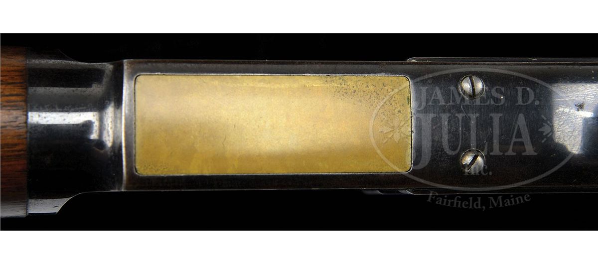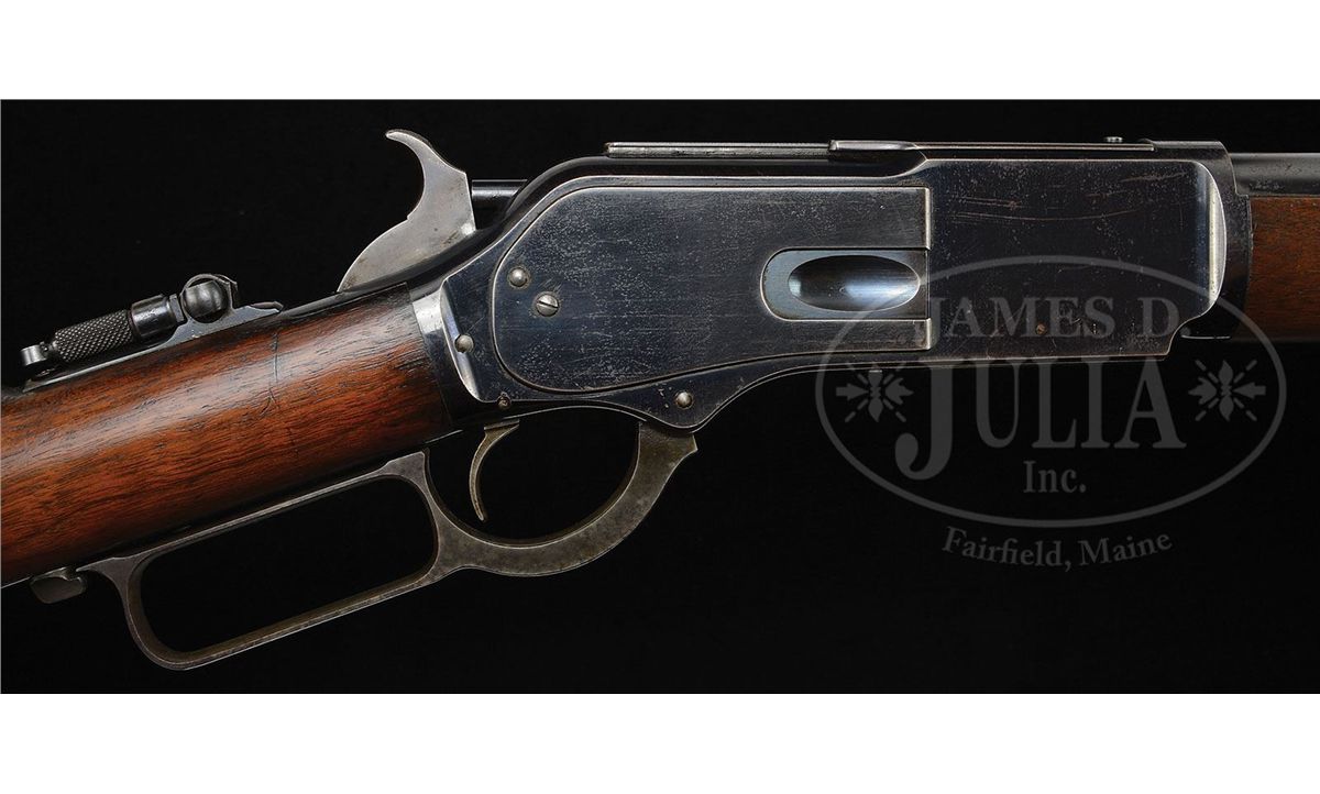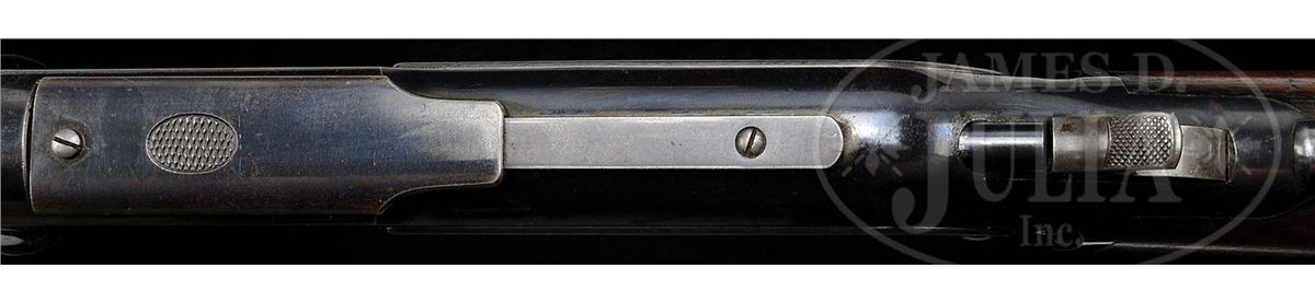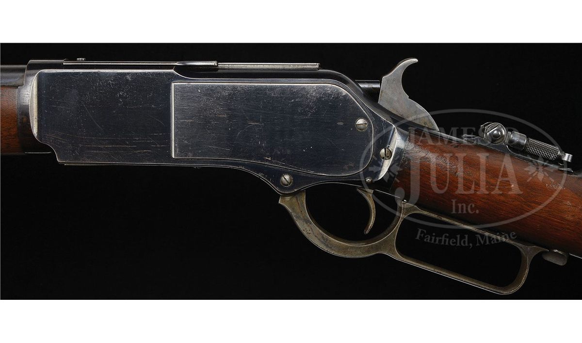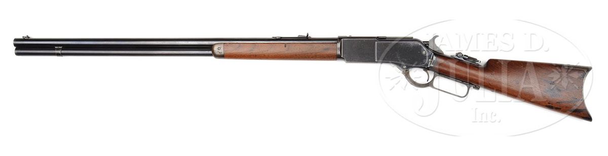 SN 6831. Cal. 45-75. Standard grade rifle with 28" rnd bbl, full magazine, ivory bead Beach's combination front sight, flat top rear sight & Lyman combination tang sight. Receiver is 2nd type with screwed-on dust cover rail and 2nd type dust cover with impressed thumbprint. Mounted with uncheckered, straight grain American walnut, straight stock & crescent buttplate with trap containing a 4-pc brass & steel cleaning rod, missing the section with slotted tip. Instead it has a brass slotted tip with threads to match the female ends of the rods. This rifle was produced in 1878 at the height of the Great Westward Expansion of Manifest Destiny & likely would have served on the American frontier or other far away outposts such as the Northwest Territories or Alaska. These rifles in this caliber were also very popular in the deep woods of North America. The Model 1876 was the first powerful big bore rifles on the American market & were in great demand until supplanted by more modern cartridges in the late 1800's. PROVENANCE: Woody Frey Collection. CONDITION: Extremely fine. Bbl & magazine tube retain 95-97% strong orig blue with very minor muzzle edge wear and some light thinning over forearm area. Receiver retains about 95% glossy orig blue with sharp edge wear, some minor candy striping & a few tiny freckles of surface etching. Dust cover retains about 95% orig blue. Hammer retains faded case colors with faded colors on sides of the lever, turned to silver on outer faces. Buttplate retains smoky case colors, mostly turned silver with fine pitting on the heel and toe. Wood is sound with a series of small nicks on left side of buttstock, some dark discoloration on left side toward the heel, a couple small streaks of dark staining on right side of the comb & overall retains most of it's orig oil finish. Forearm has a couple small bruises & a large one on the left side and retains a hand worn patina. Mechanics are crisp. Very bright, shiny bore, may have fired but if so, very little. 4-48420 JR172