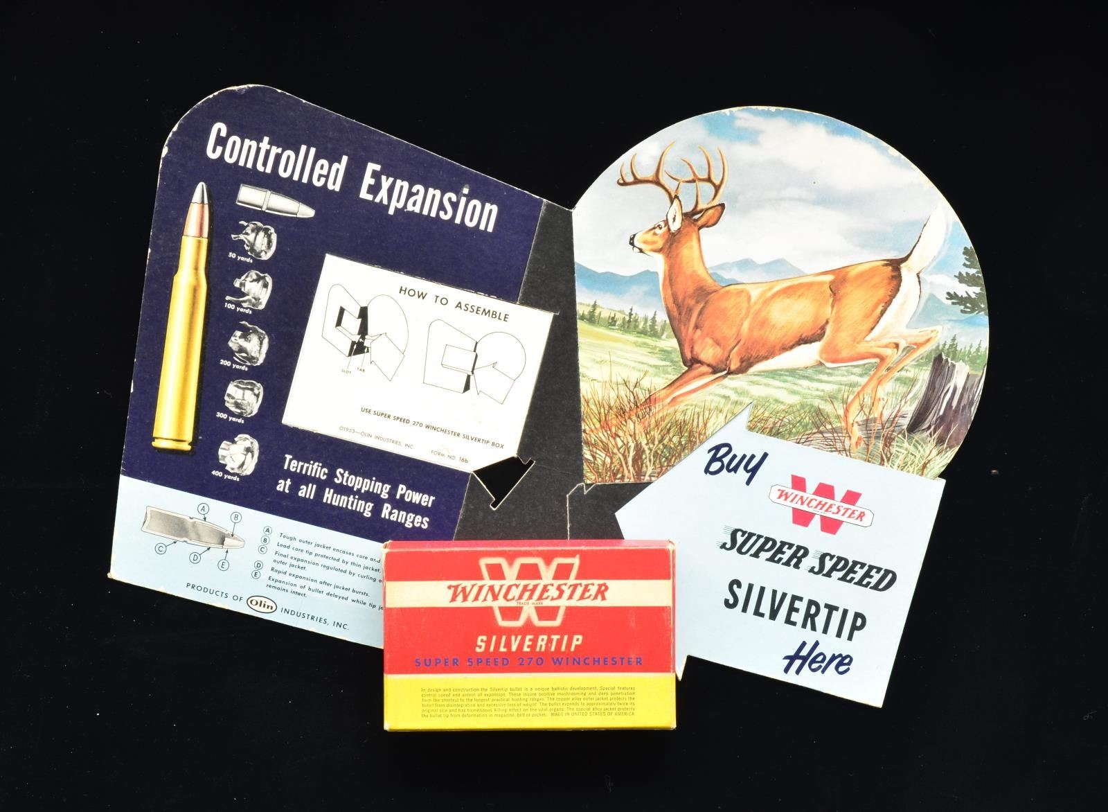 16 1/2" x 12" Olin Industries die cut fold out advertising Winchester Super Speed ammunition & the Silvertip bullet. The display features a mountain scene w/ a running mule deer buck along w/ diagrams of the 270 cartridge, Silvertip bullet & bullet images showing expansion at ranges from 50 - 400 yards. At center of display is an intact punch out that allows display of a red & yellow 270 Winchester Silvertip box. Cutout is marked "FORM NO. 16B" w/ 1953 date. CONDITION: display appears to be unused showing tattering at edges. Ammunition box shows some fading. (02-13983/DS). $350-700.