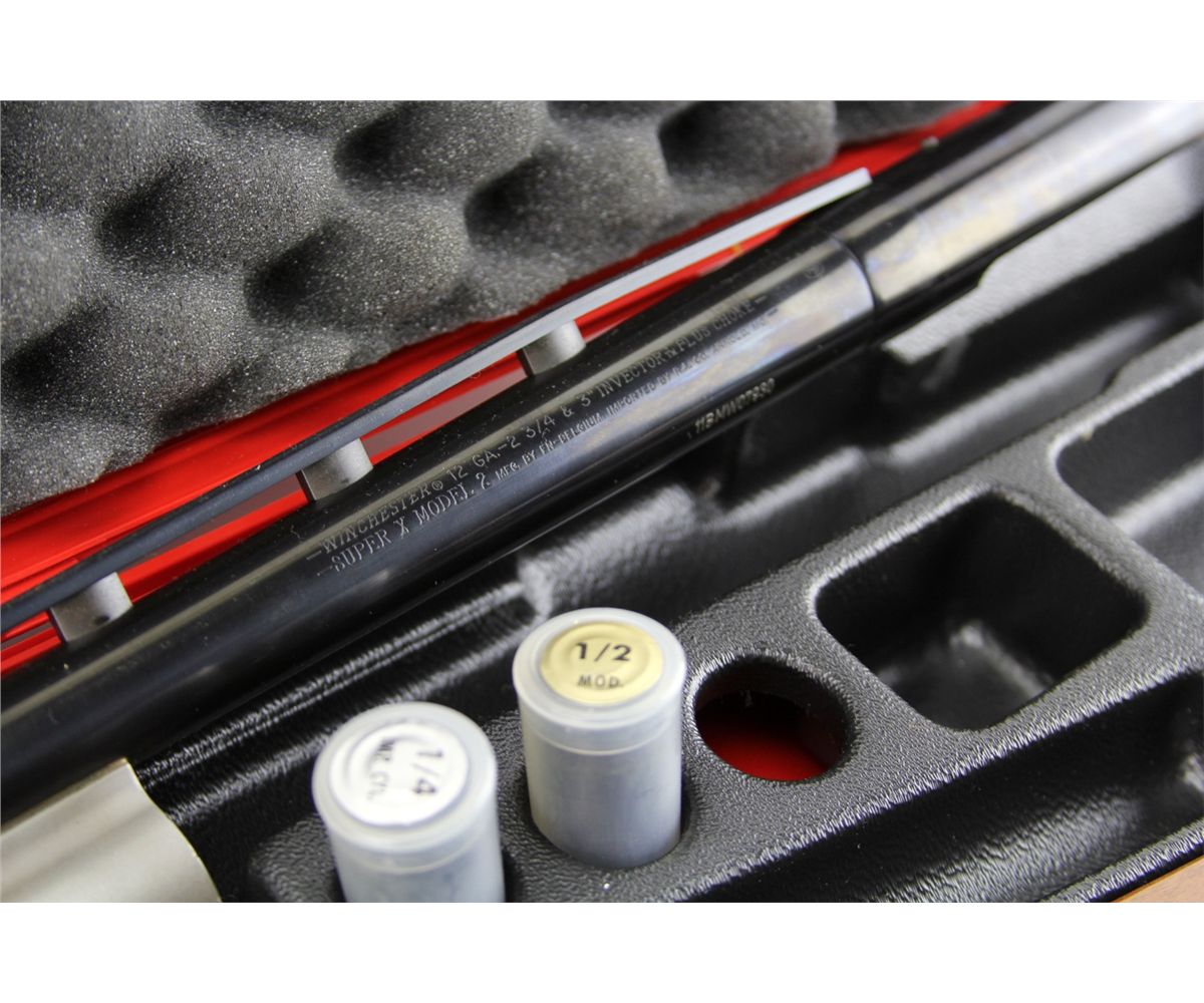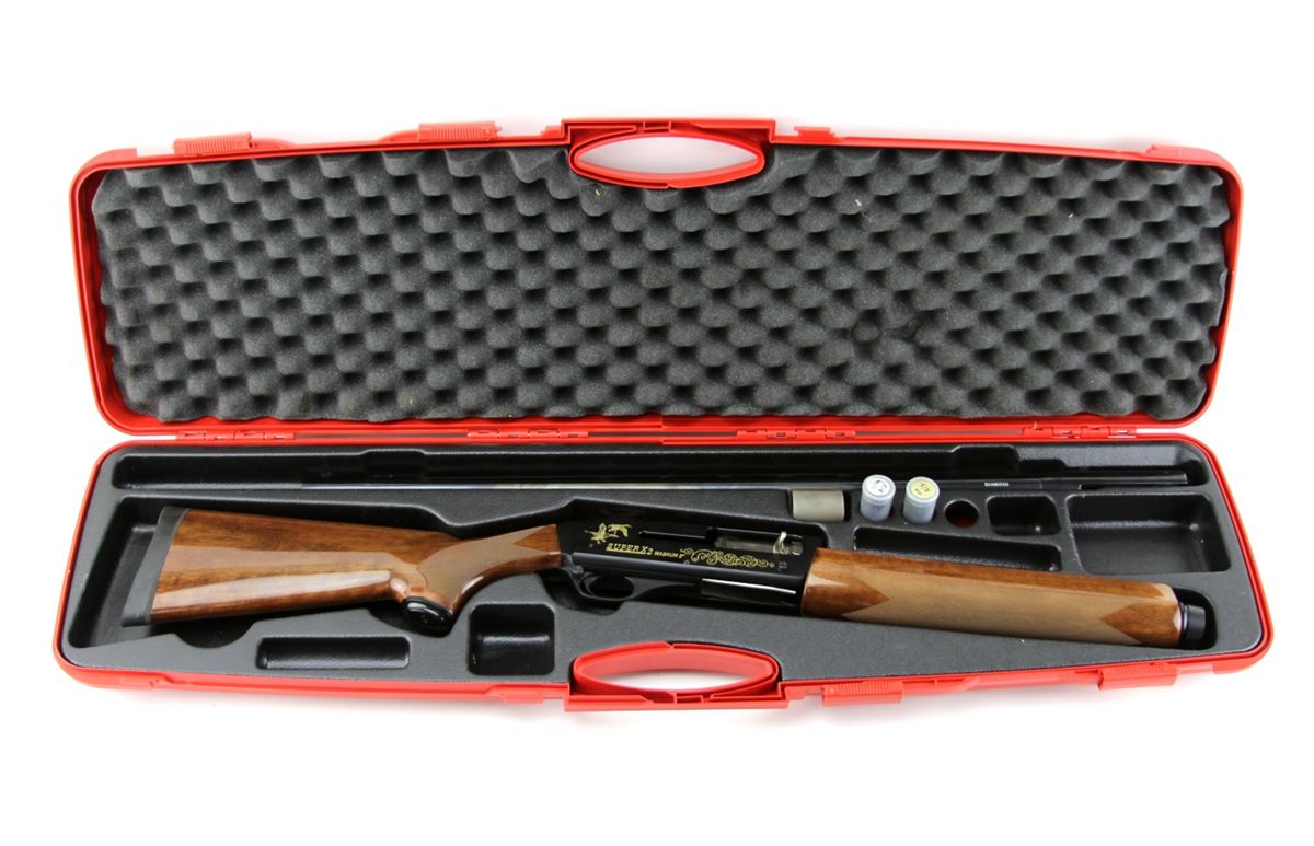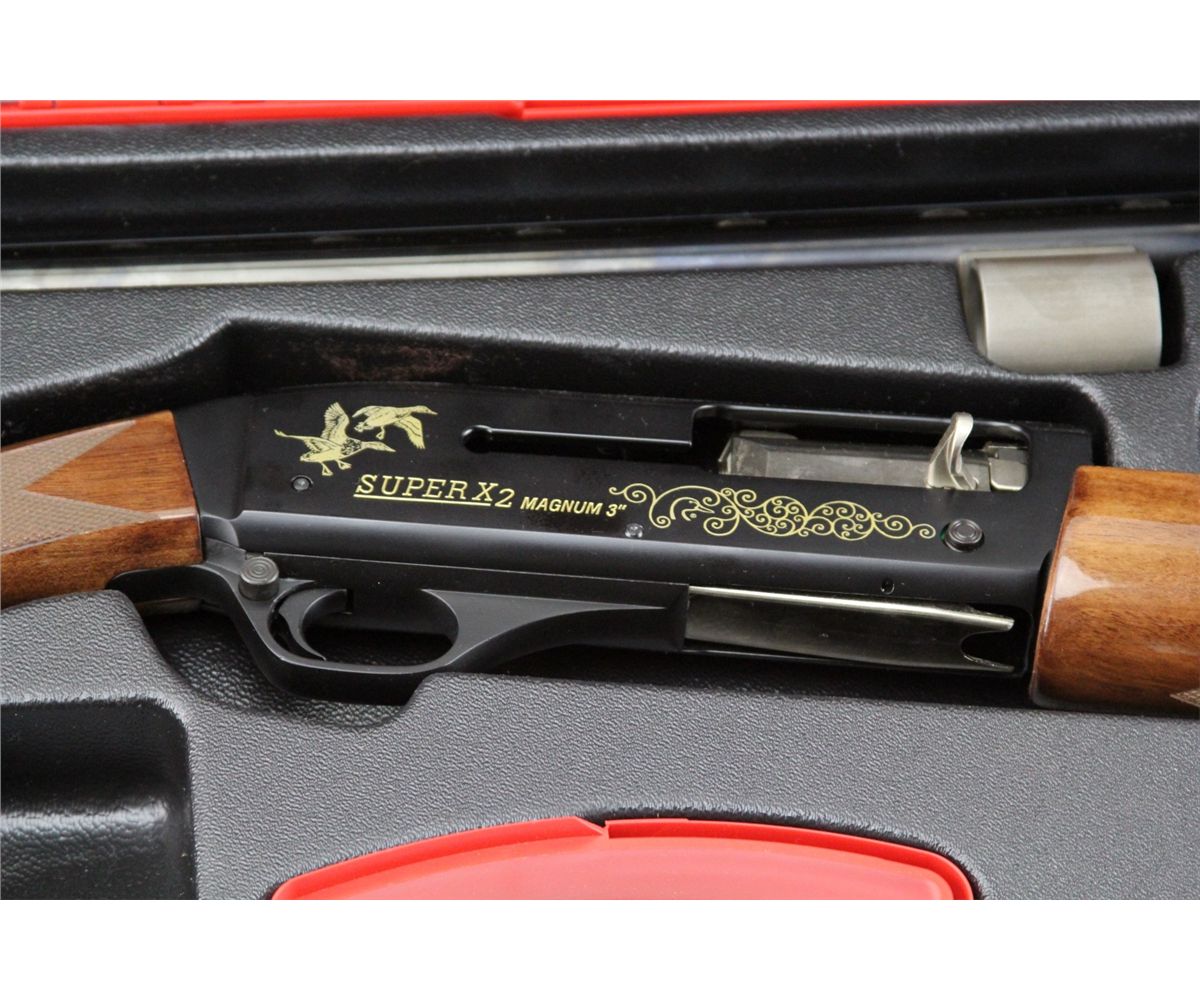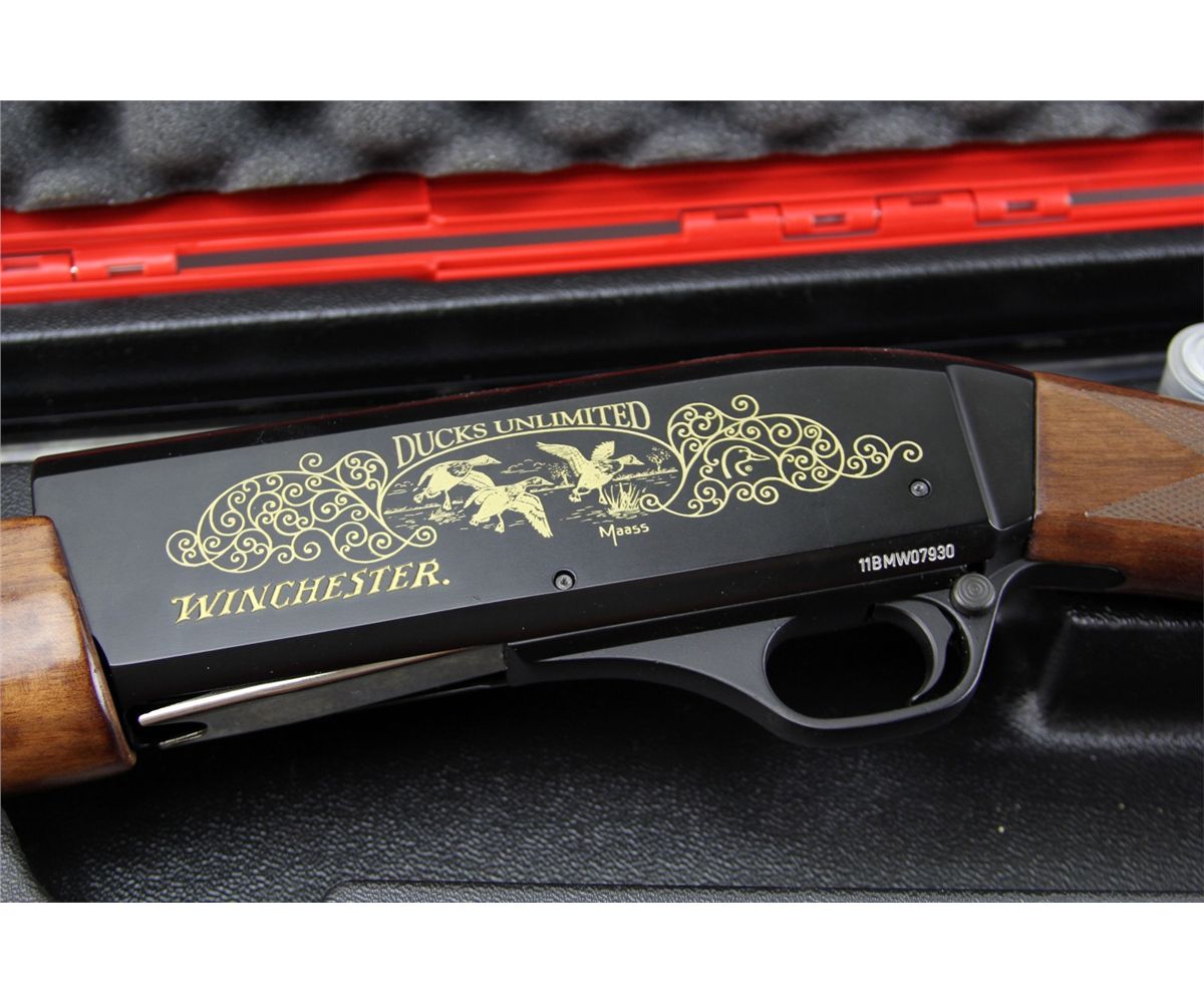 Winchester Super X2 12 Gauge Ducks Unlimited Semi-Automatic 3" Magnum Shotgun, manufactured by FN, Belgium for Winchester. This model was the 2004-2005 Gun of The Year. Features a deep blued receiver with special gold filled engraving by Baron. Artwork is from international artist David Maass. Stock and forearm are satin gloss finished walnut with standard checkering. Anodized, back bored, vent rib barrel, with 3 invector-plus chokes. Gun lock, instruction manual and case are also included.