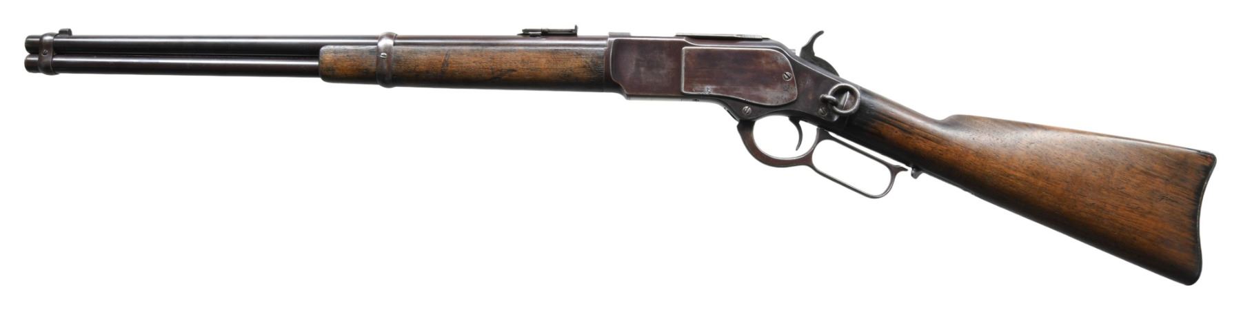 RING CARBINE. Cal. 44 WCF. S# 520155B. Bbl. 20" rnd. with fixed front sight and carbine leaf rear sight. Full length mag. Action has saddle ring on left side. Walnut forearm and straight grip stock with trapdoor carbine buttplate. Mfg. in 1898. UNATTACHED ACCESSORIES: 4-piece cleaning rod held in stock compartment. CONDITION: metal finish has faded to brown showing carry wear with scattered spots of pitting. Sanded and refinished wood have age darkened worn appearance with scratches and marks. Sound mechanics. Dark bore retains intact rifling showing scattered pitting. (01-27972/DS). ANTIQUE. $2,500-3,500.