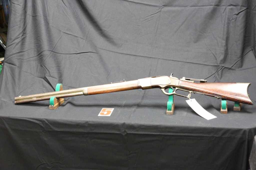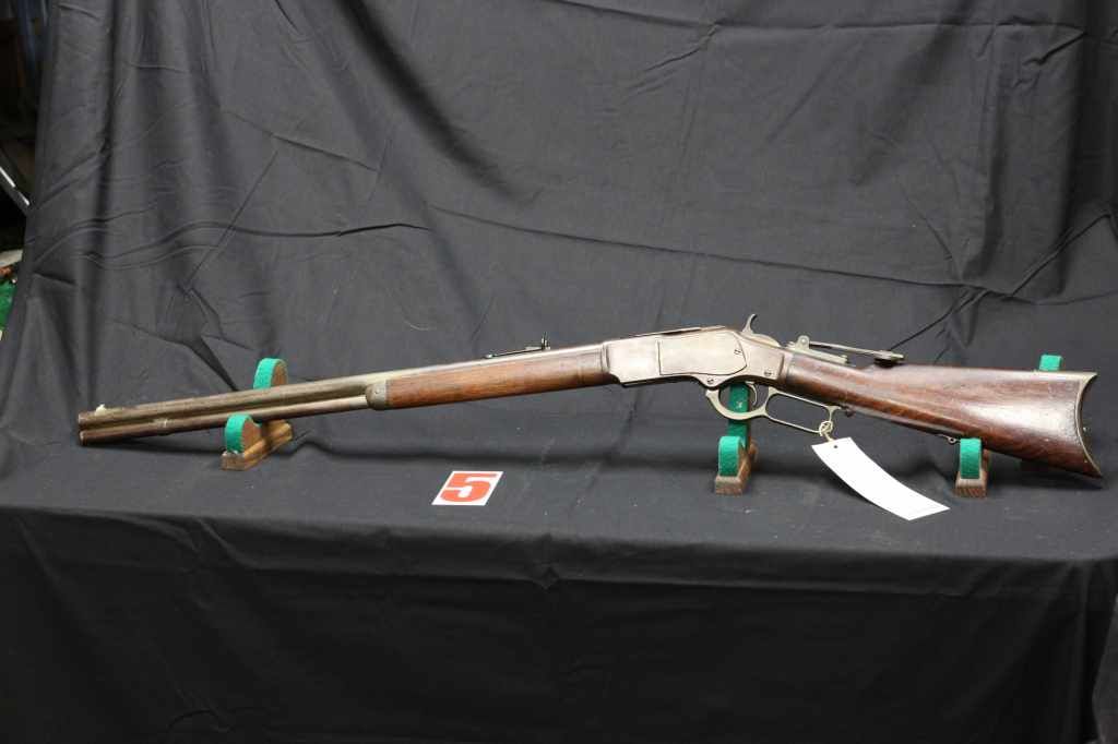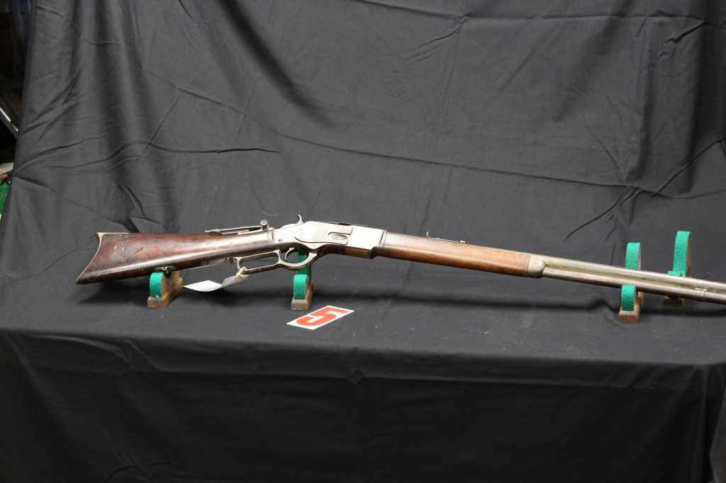 WINCHESTER MODEL 1873. 24 INCH ROUND BARREL, YOP 1881. GOOD OVERALL, VINTAGE REAR PEEP SITE, FRONT SITE REPLACED. VG+ BORE. NO VISIBLE SIGNS OF CRACKS IN WOOD. LOOKS TO HAVE POSSIBLY BEEN SILVER PLATED AT ONE TIME. 44-40 CAL. IF CLEANED