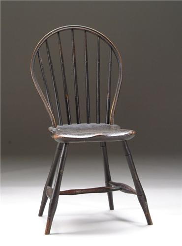WINDSOR BOW-BACK SIDE CHAIR. Seven spindle back with molded edge hoop, carved saddle seat, nice tall bamboo style splayed legs. Original dark finish. SIZE: 36in. h x 17-3/4in. seat h. CONDITION: Very good. 9-26230