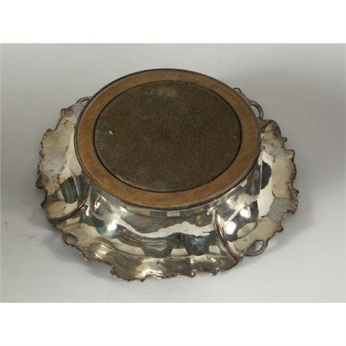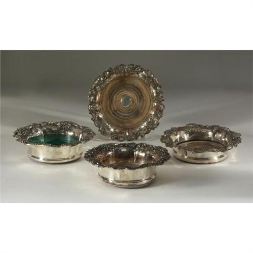 SILVERPLATE: Four wine bottle coasters, silverplate grapevine repousse borders, turned wood bottoms, unattributed, 2'' x 7.5'', two coasters having central silverplate buttons with a fist holding an arrow insignia, wear commensurate with age, early 20th century.