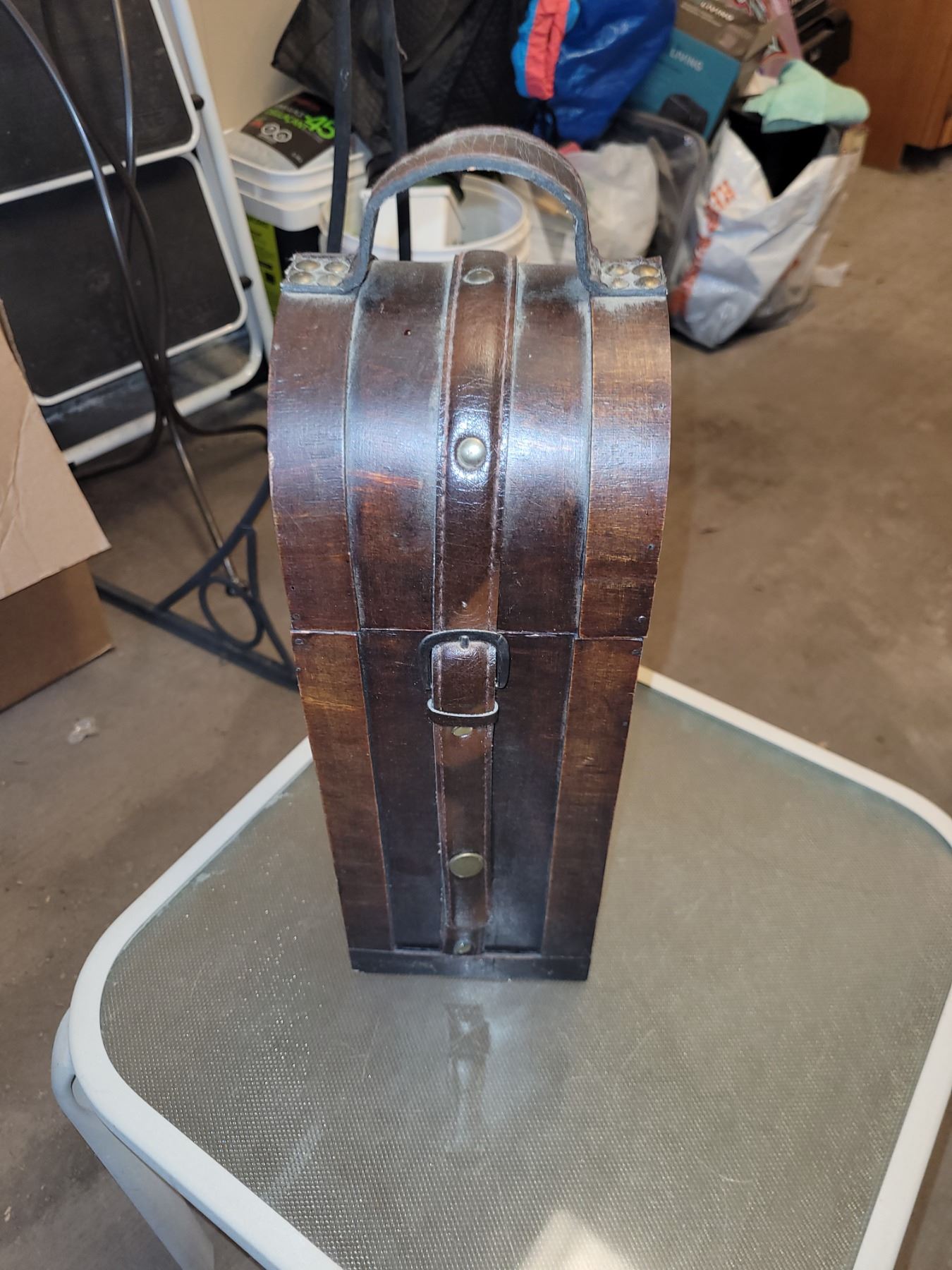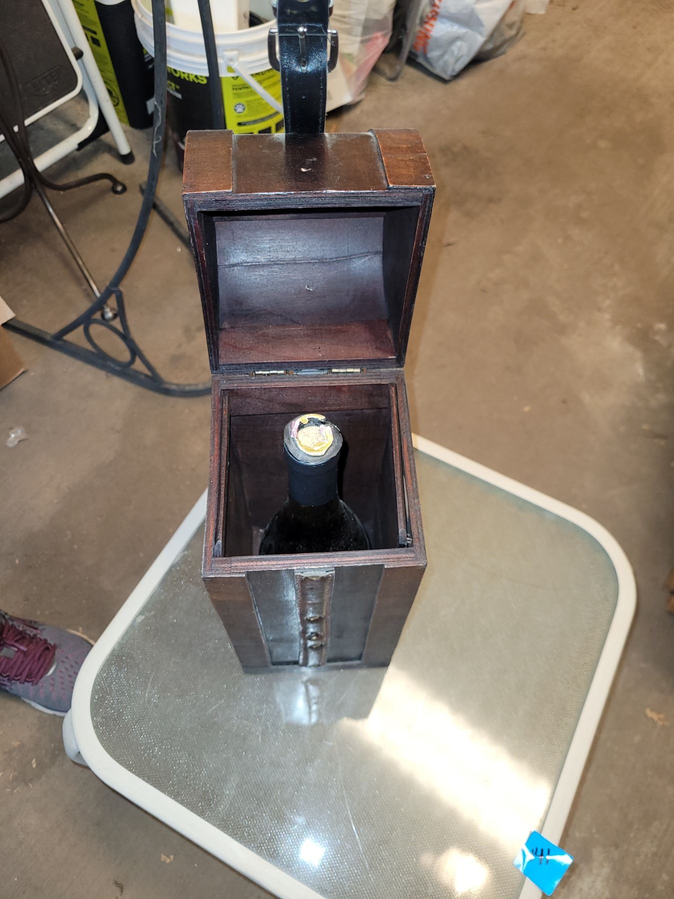 WINE BOTTLE GIFT BOX. MADE OF WOOD AND LEATHER(ETTE MAYBE, UNSURE). AS IS WHERE IS. NO REFUND. NO RETURNS