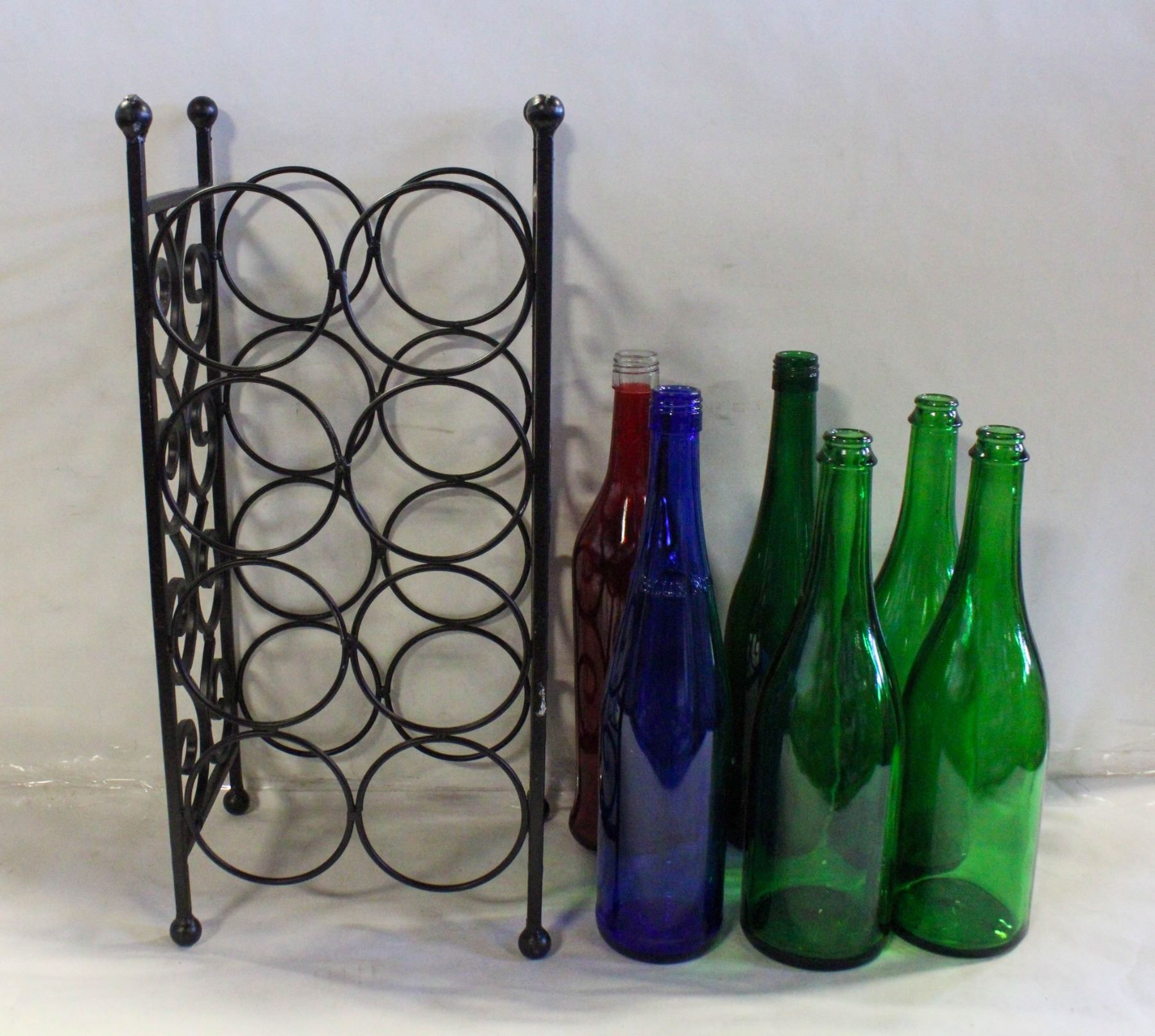 WINE RACK, BROWN METAL & 6 COLORED BOTTLES