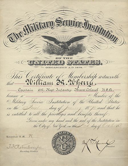 (1824 - 1886) Union major general severely wounded facing Pickett's charge at Gettysburg, also active at Antietam, Fredericksburg and Chancellorsville. Fine association partly-printed D.S., 1p. 4to., New York, Oct. 1, 1881, a certificate of membership in The Miltary Service Institution on the United States presented to William M. Wherry, boldly signed by Hancock as president, also signed by Gettysburg Medal of Honor awardee THEOPHILOS F. RODENBAUGH as Secretary. Some dust soiling, largely at bottom, else very good. William M. Wherry (1836-1918) was awarded the Medal of Honor for his actions at the Battle of Wilson's Creek on Aug. 10, 1861, where he "displayed conspicuous coolness and heroism in rallying troops that were recoiling under heavy fire" while serving as a First Lieutenant of Co. D, 3rd Reserve Missouri Infantry.