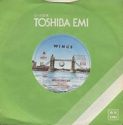 WINGS With A Little Luck (Original 1978 Japanese solid centre 7" single with 'London Town' picture labels, also including Backwards Traveller/Cuff Link, unique picture insert with lyrics and pictorial album discography on the reverse.