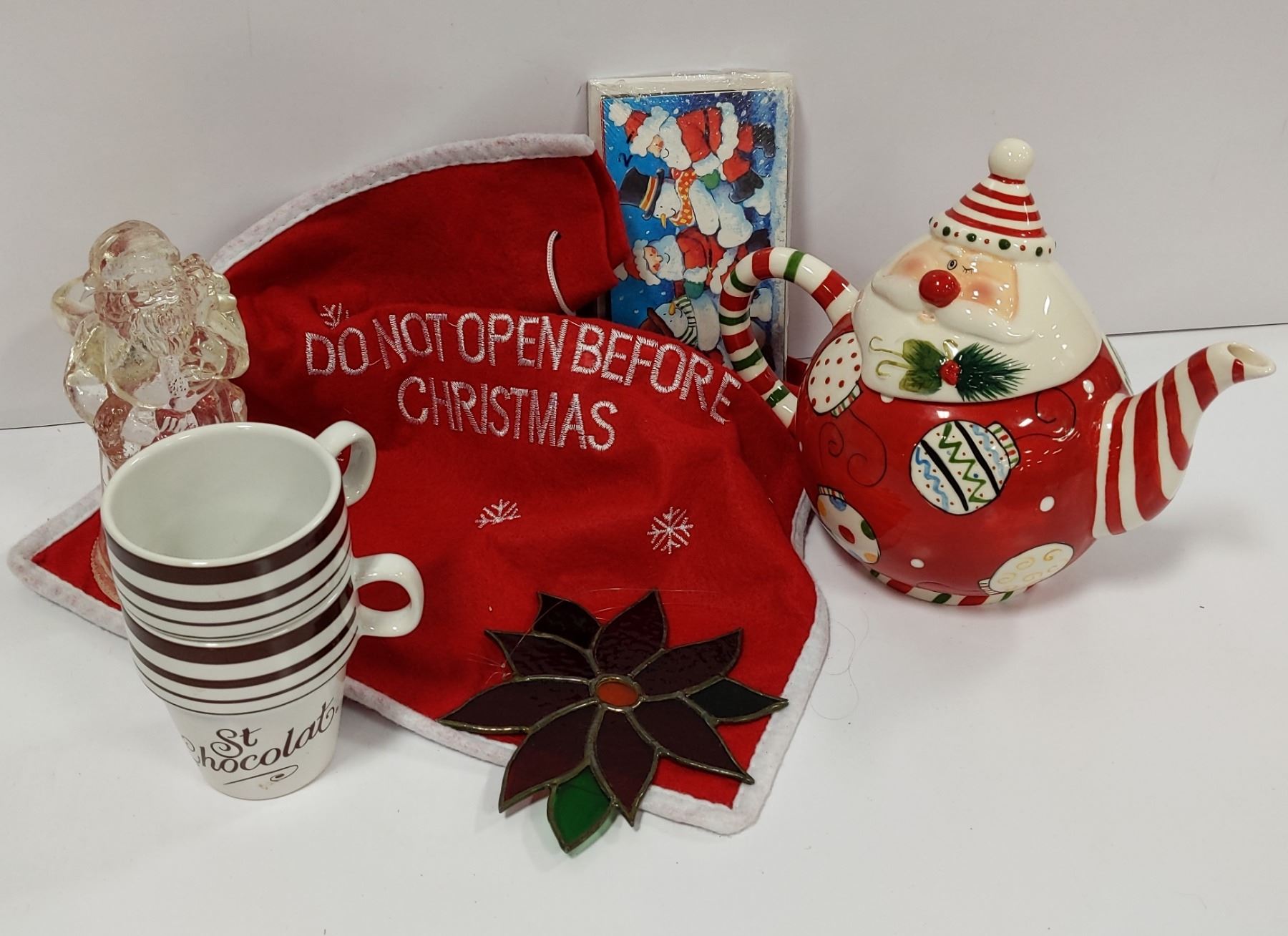 WINKING SANTA TEAPOT WITH MUGS, SANTA CANDLE HOLDE