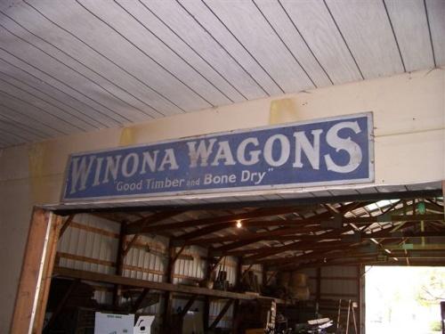 WINNONA WAGONS SIGN- SELLING AT AUCTION IN OSLO, MN 10-15-05. IT IS ABOUT 6 FEET LONG AND IN ORIGINAL CONDITION. SELLING AS-IS. IS BLUE AND WHITE.