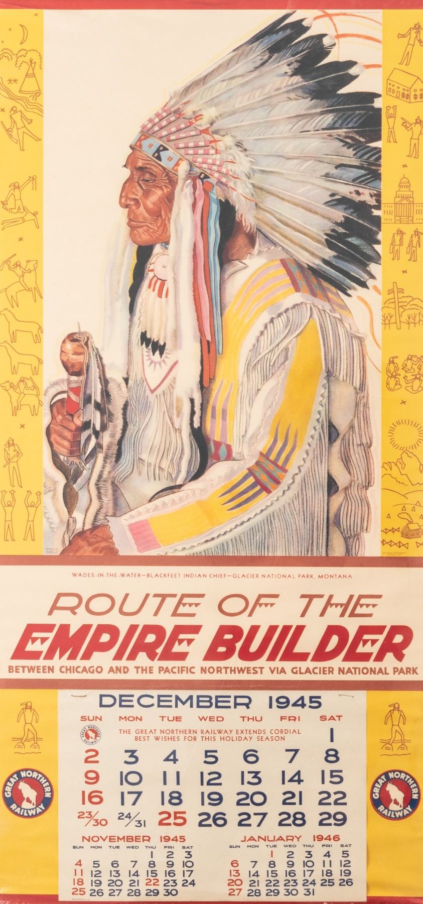 Calendar page made for the Great Northern Railway of Blackfeet Indian Chief Wades-in-the-Water. Portrait of Wades-in-the-Water was done by Winold Reiss, (1886-1953). Made in 1945, the portrait is flanked on both sides with pictorial images describing his birth story. On each side of the calendar is the printed pictorial signature of Wades-in-the-Water. On the verso, a printed biography is enclosed of Wades-in-the-Water by Great Northern Railway. 33.5 x 16 inches.