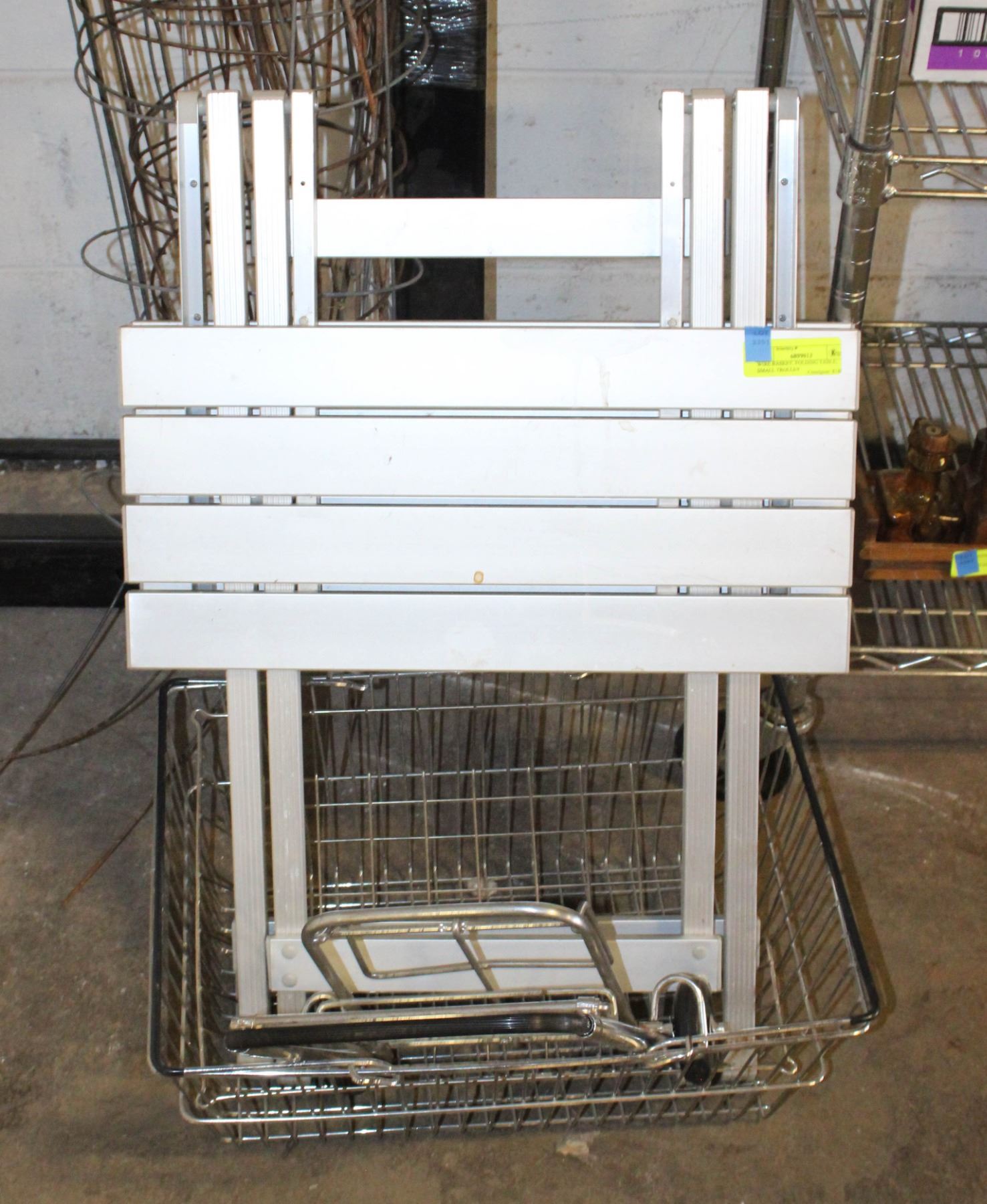 WIRE BASKET, FOLDING TABLE, SMALL TROLLEY