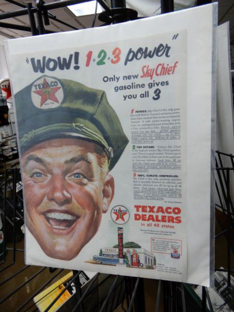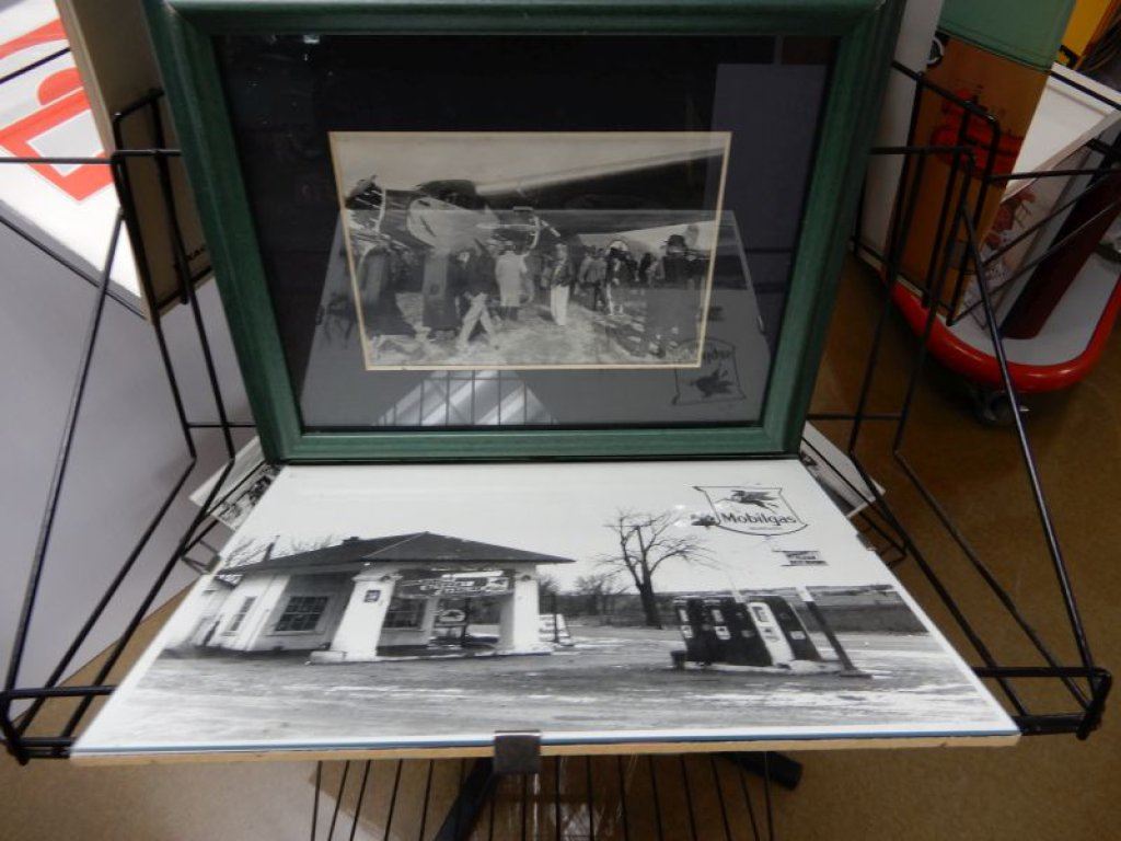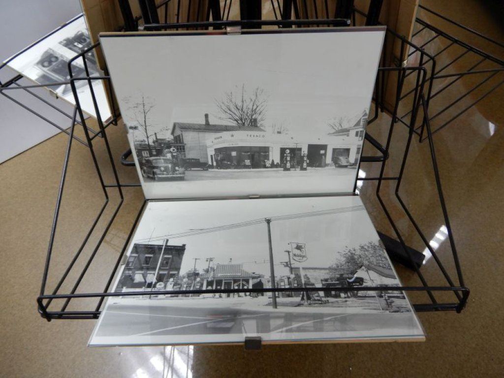 WIRE BASKET ROTATING BOOK RACK 16" X 8" BASKETS - FRAMED PHOTOS & VARIOUS TEXACO ADVERTISMENTS - 32" X 82" LOCATION: LOWER RIGHT