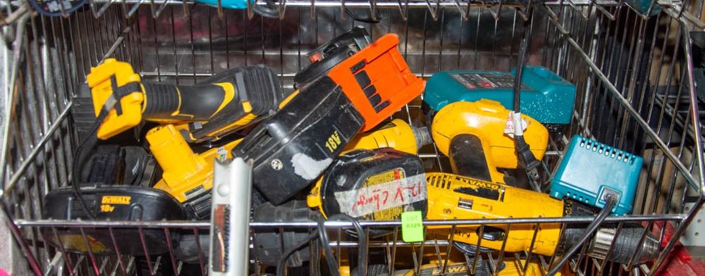 WIRE BIN FULL OF MISC DRILLS/ TOOLS/ ETC