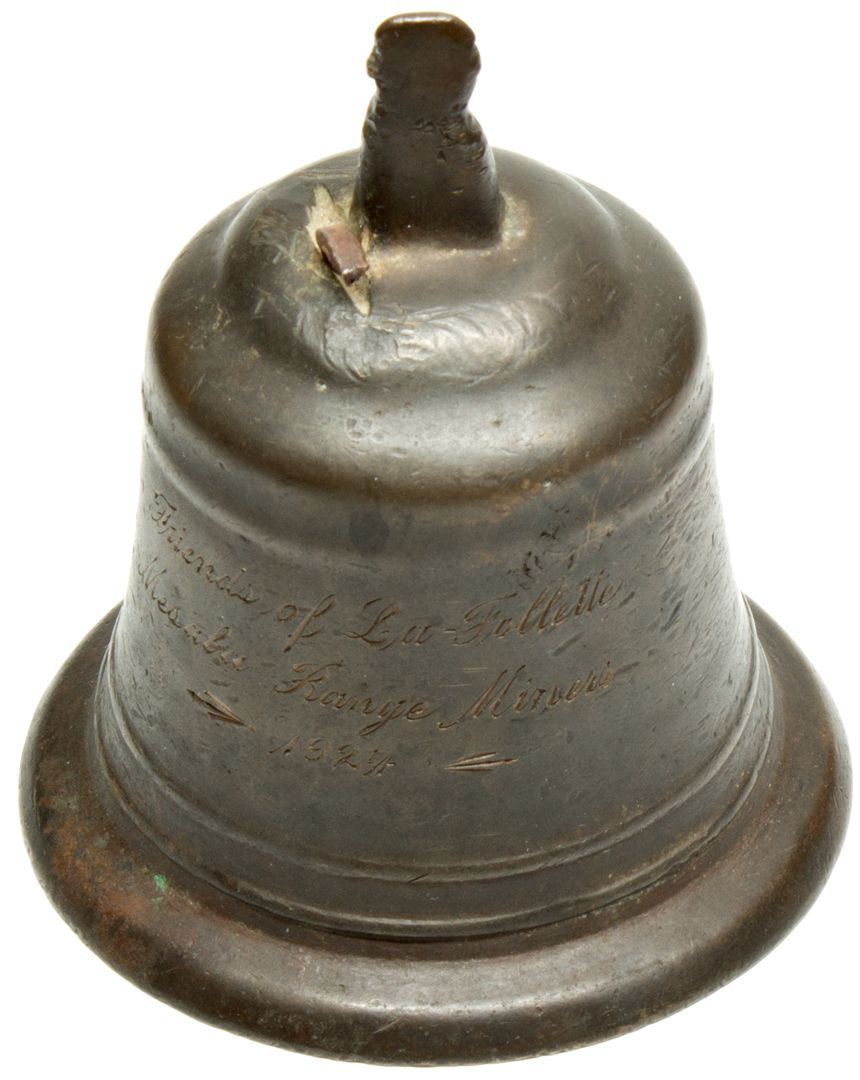 Cast engraved miniture copper bell, commerorating Friends of La Follette Mesaba (sic) Range Miners. The Mesabi Iron Range, a vast ore-producing region in Minnesota, Michigan and Wisconsin, was worked for decades in the late 1800`s and early 1900`s. La Follette ran as a progressive candidate in the 1924 Presidential election. He gave a speech to a Miners` hall in Wisconsin, and was presented this bell. Robert M. La Follette Sr. was a US House representative from 1885 to 1891, and became Wisconsin`s governor in 1901, through 1906. HKA#62548