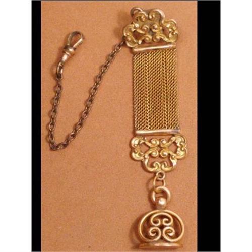 This has two colors of pink and yellow of gold filled metal. The wide mesh chain is 3" long and 1" wide with fancy tops and bottom. The extra watch chain is 4 ½" long from end to end including the clip. The fob is heavy and has never been impressed or engrave on the bottom. IN very good condition.