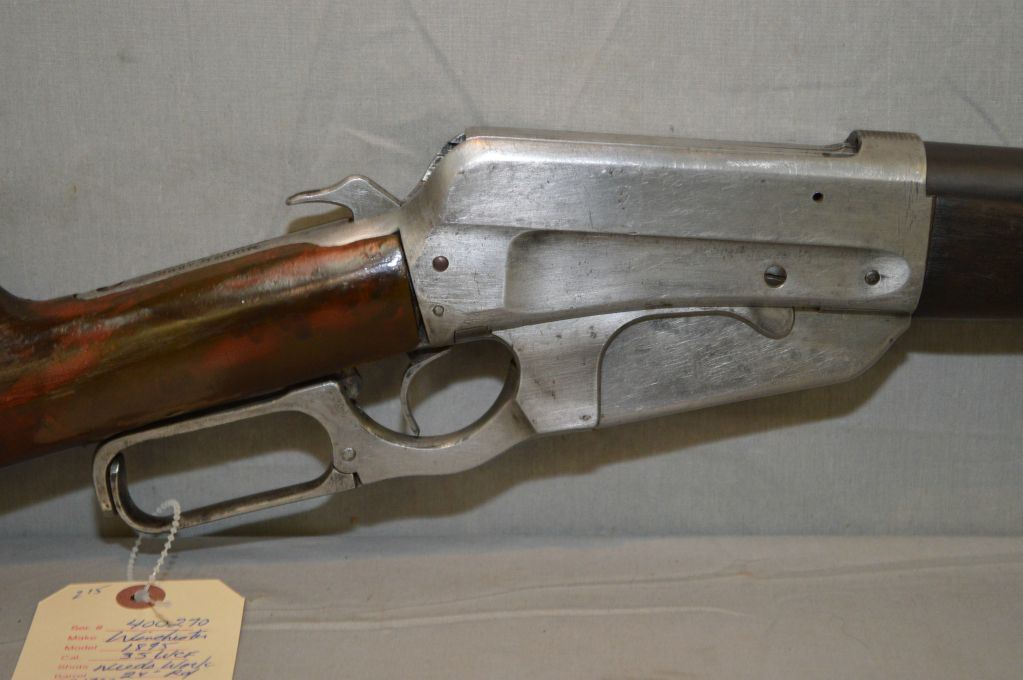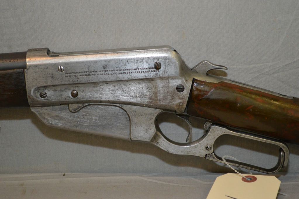 WInchester Model 1895 .35 WCF cal Lever Action Rifle w/ 24" rnd bbl [ barrel reblued, barrel sights missing the lift, receiver , lever, etc. polished, needs work, does not function, missing the back tang screw, butt stock appears repaired, fits poorly w/ crescent butt plate, fair forend, (325 ) ] Circa 1920 ] Ser # 400270