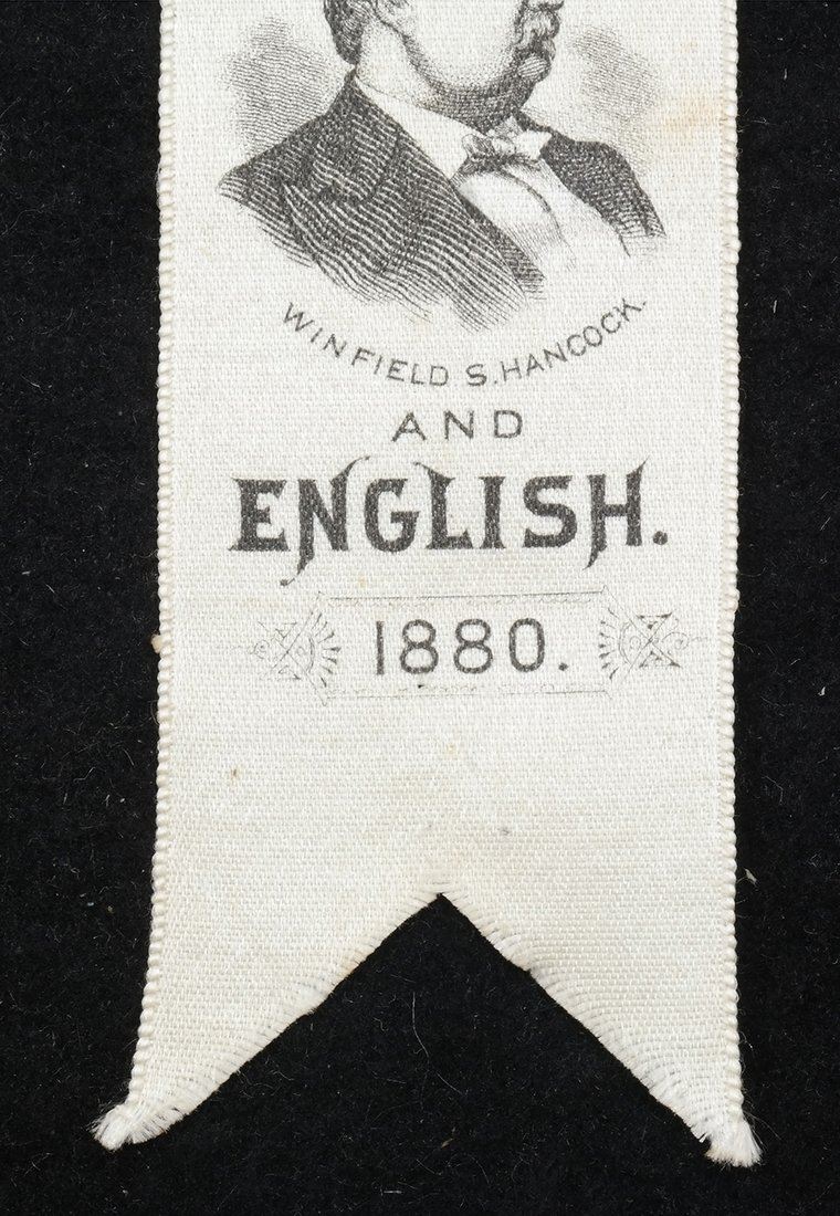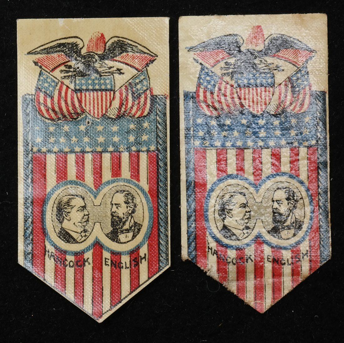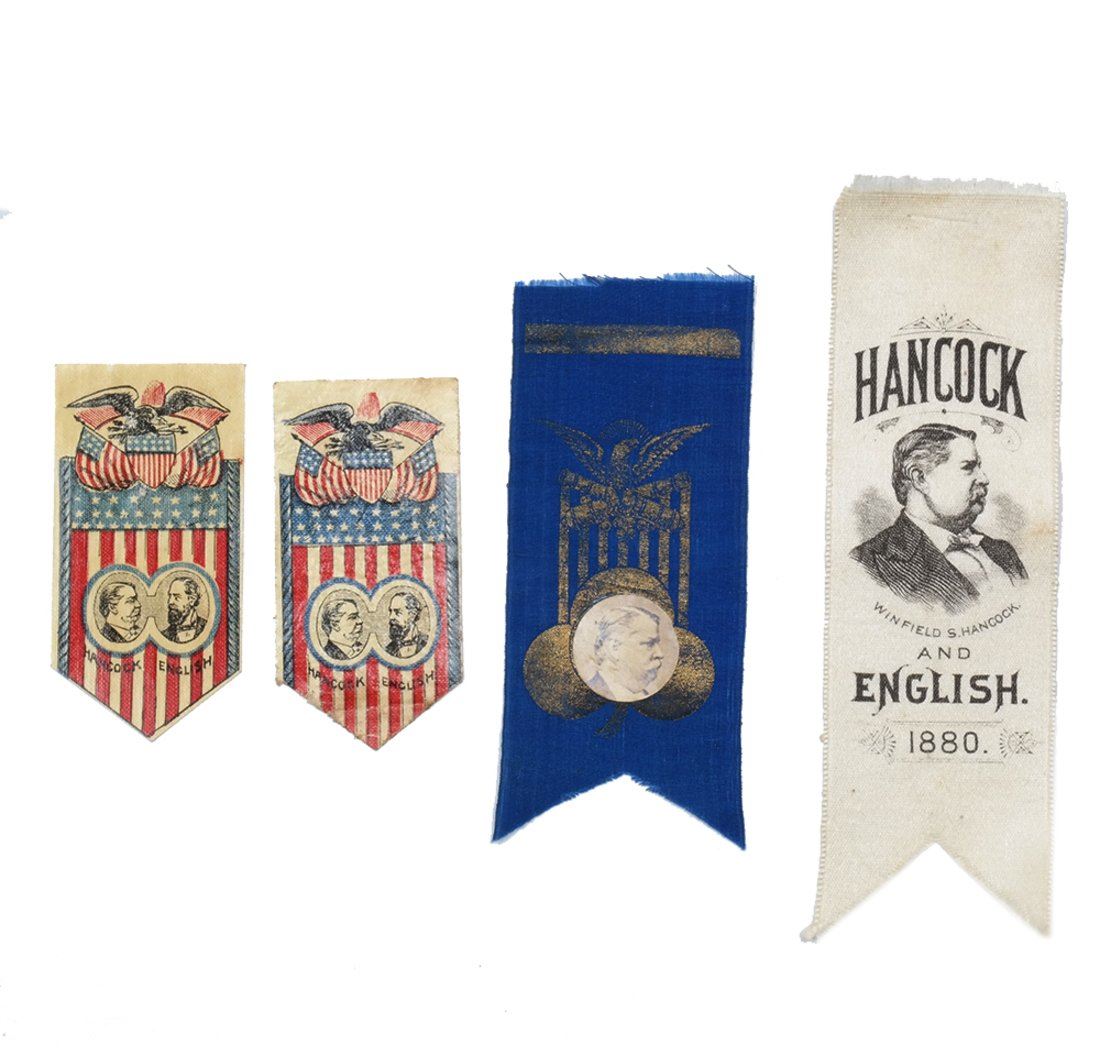Comprises: 1.) Gold stamped blue satin ribbon with applied albumen portrait of Hancock. 2.) Two glazed cotton ribbons printed in red, blue and black with jugate portraits of Hancock and English. 3.) White satin ribbon with printed portrait of Hancock in a bust length 1/2 profile pose.
