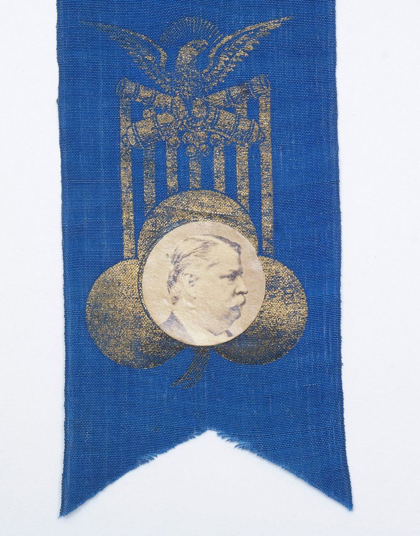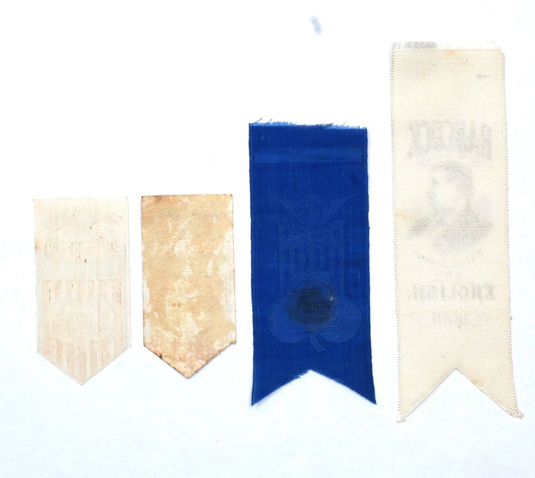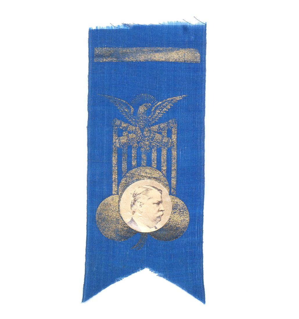 Comprises: 1.) Gold stamped blue satin ribbon with applied albumen portrait of Hancock. 2.) Two glazed cotton ribbons printed in red, blue and black with jugate portraits of Hancock and English. 3.) White satin ribbon with printed portrait of Hancock in a bust length 1/2 profile pose.