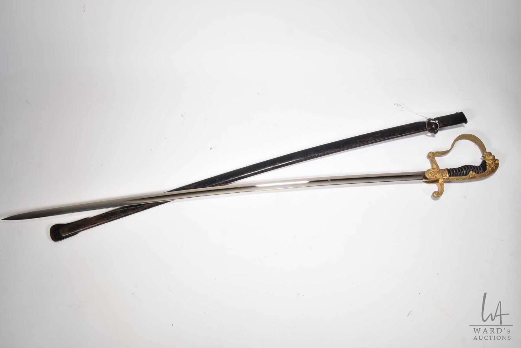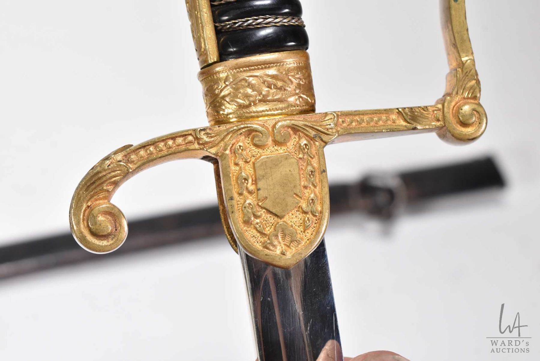 WKC WWII German Nazi lion head sword with scabbard manufactured by WKC, features a lion head pommel, oak leaves and acorn accents, the cross guard has the Nazi eagle and blade marked under cross guard WKC, 37 1/4" in length