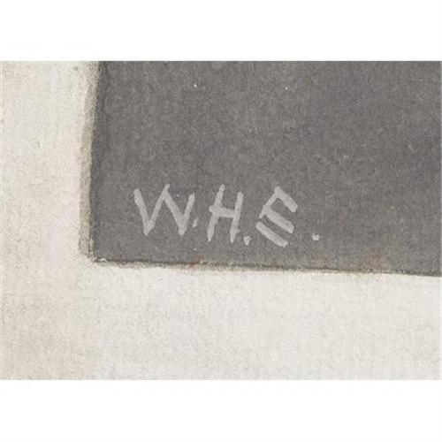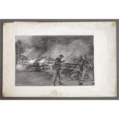 <B>WILLIAM HENRY SHELTON GOUACHE “BREASTWORKS ON FIRE”.</B></I> Shelton was born at Allen's Hill, New York. Had a great war record, 1st N.Y.L.A., he was a Union artilleryman commanding a center section of Battery D at the Battle of the Wilderness, and was badly wounded and taken prisoner deep into the South. He worked his way from enlisted man to captain, and is singled out in the Official Records for gallantry (Vol. 25, part1). He is also mentioned in the silver Time-Life series (in the <I>Killing Ground</B></I> volume pages 64-65). He is listed in the <I>Dictionary of American Artists, Sculptors and Engravers</B></I>. These types of his works appear in Goss’ recollections of a private. A painter, illustrator, and writer, he was a well-credentialed artist who studied at the Art Students League and exhibited at the Brooklyn Art Association, the Boston Art Club, the Pennsylvania Academy, and the Art Institute of Chicago. This Gouache painting by Shelton, "Breastworks on Fire" has Civil War soldiers with rifles, and in the background, an American flag; his initials are in bottom left corner "W.H.S.". Image measures 13” x 8.25” on hard card 18.5” x 12.25”. <BR><BR><B>Condition:</B></I> Fine, some discoloration on card.<BR><BR><b>Shipping:</b> Flat Material, Small (<a target="_blank" href="http://www.heritageauctions.com/common/shipping.php">view shipping information</a>)