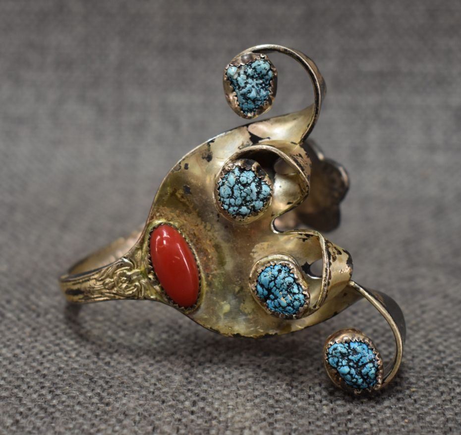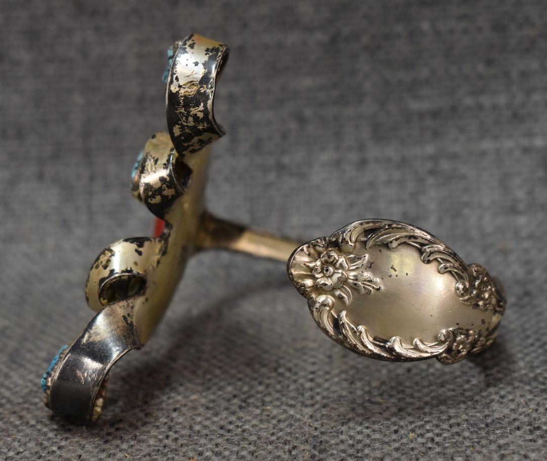 1970-80's WM Rogers silver plated fork made into bracelet with turquoise and coral 2.75" x 6.5" x 1"