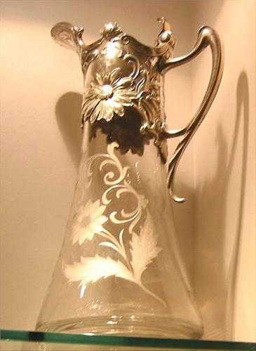 WMF - A German crystal decanter with etched floral decorations and engraved plated beaker and scroll handle. Circa 1910. Approx. 11" high. 1800-2200