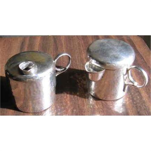 Each piece is marked WMF at the base of the handle. Hand hammered surface. The lid of the creamer has very slight plate loss showing the brass base metal. The sugar is shaken out a teaspoonful at a time. The sugar is 2.3/4" tall the creamer 2.1/2" tall.