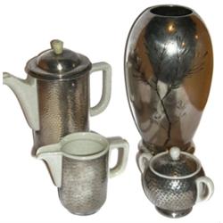 WMF vase, bulbous footed form in silver with incised pine branch, polished original patina, 10"h; with a WMF teaset, teapot, creamer and sugar, hammered silver with porcelain spouts and handles, teapot has ivory feet and finial, all marked, largest is 8"h, polished patina, minor flakes to ivory and break to hing of teapot