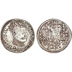POLAND. LITHUANIA. STEPHEN BATHORI (1576-1586). SILVER 3 GROSS 1581. AVF