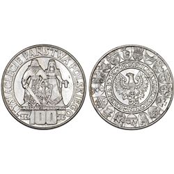 POLAND PRL. SILVER 100 ZLOTY 1966 "POLISH MILLENIUM". AU