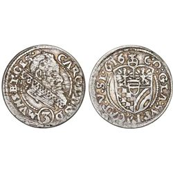 Mint: Brieg Obv: Two Ornamented shields under Ducal Crown Rev: Arms of Duchy,. Weight: 3.2 gm Reference: FuS 1951 Grade: AVF, roll dies struck. RARE,