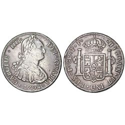 Mint: Potosi Obv: CAROLUS IIII DEI GRATIA. Laureate, draped and cuirassed bust right. Rev: HISPAN ET IND REX SP 8R PP. Crowned coat of arms flanked by