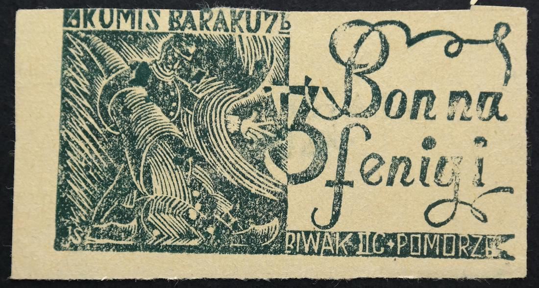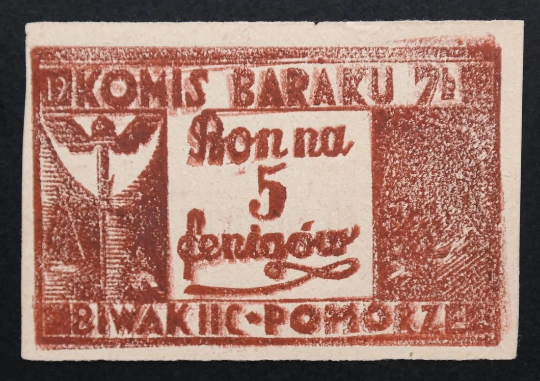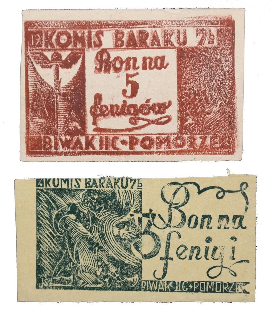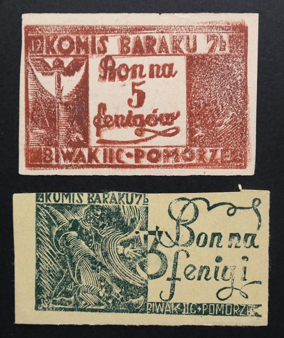 KOMIS BARAKU 7b / BIWAK IIC POMORZE 3fen, manuscript serial #014 and signatures on back, and 5fen, manuscript serial #042 and signatures on back, both sound and F-VF.