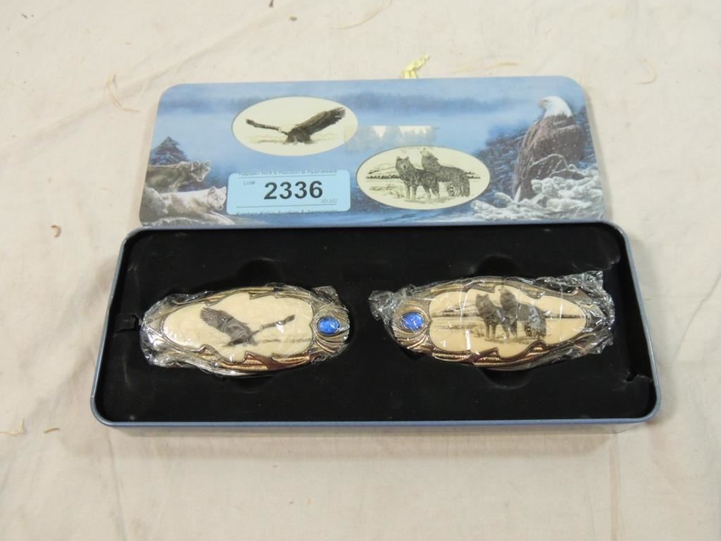 POCKET KNIFE TIN SET, WOLF AND EAGLE POCKET KNIFE AS SHOWN SEE PHOTO FOMRORE DETAILS.