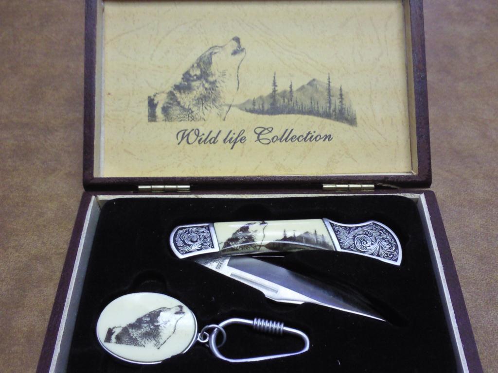 WOLF KNIFE AND KEYCHAIN IN WOODEN BOX