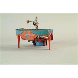 Lot # 909 WOLVERINE XYLOPHONE W/UP TOY. All tin American toy features animated clown at xylophone. Song disc included is for "Yankee Doodle". SIZE: 7-1/2" w. CONDITION: A good working original. 1-29426 (200-400)