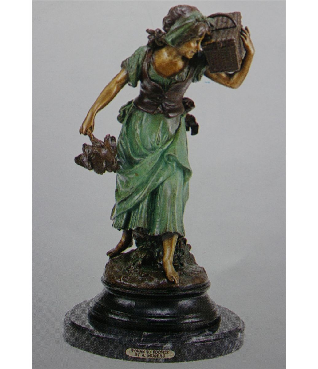 "WOMAN WITH ROOSTER" BRONZE SCULPTURE - AFTER A. MOREAU - BEAUTIFUL COLOR PATINA - MOUNTED ON A FINE ITALIAN MARBLE BASE - BEAUTIFULLY DETAILED - SIGNED - MINT CONDITION - 27"H X 12"W - LOST WAX CAST BRONZE