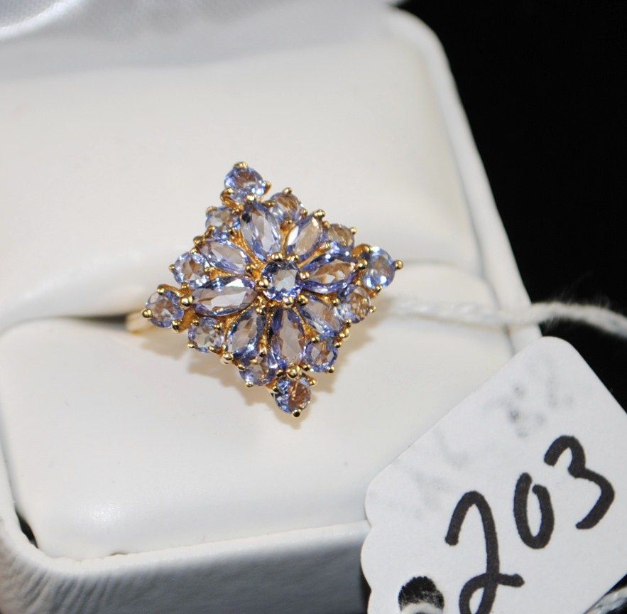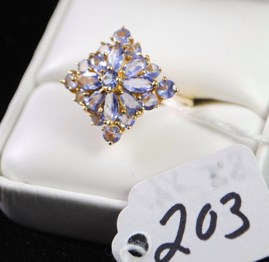 WOMANS 14K YELLOW GOLD TAZANITE RING WITH EIGHT MARQUISE CUT AND THIRTEEN ROUND TANZANITES SET IN 14K YELLOW GOLD RING - WEIGHS 3.8 GRAMS OF 14K GOLD!