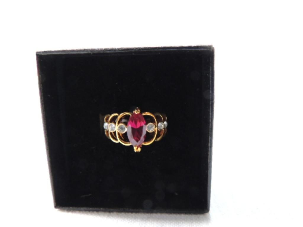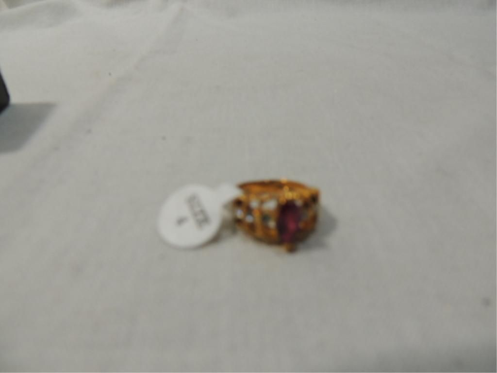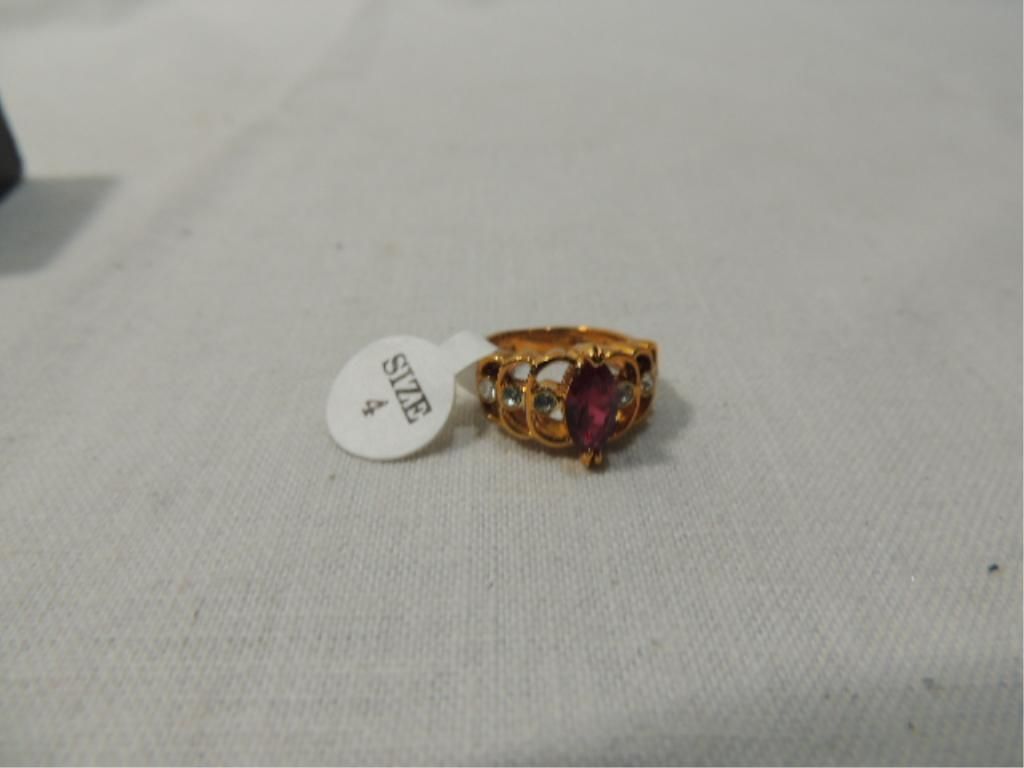 WOMANS RING SIZE 4 GOLD TONE RUBY CENTER STONE CZ ACCENTS ON SIDES. SEE PICTURE FOR DETAILS