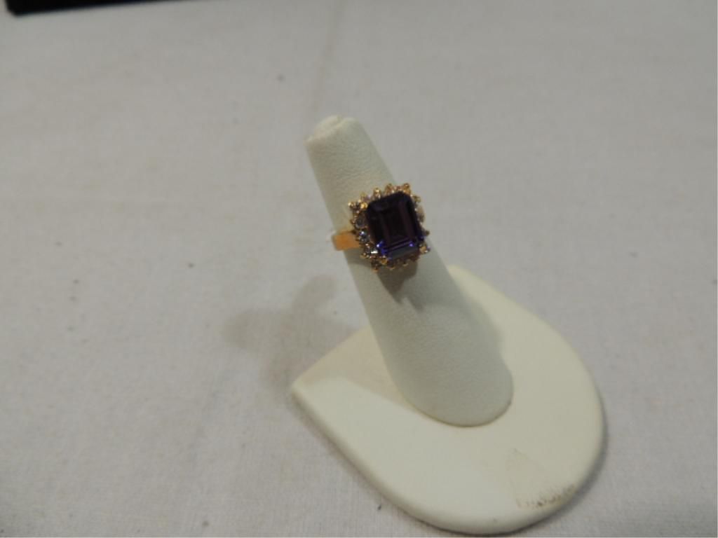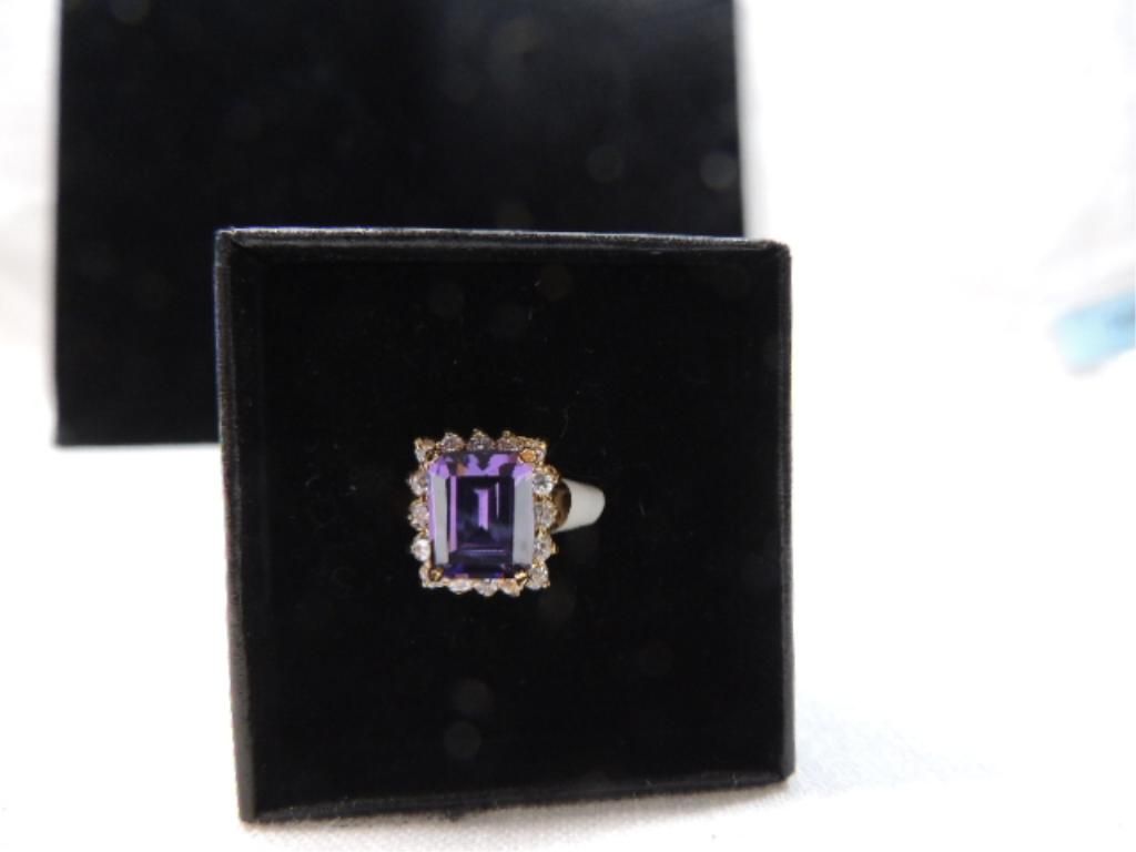 WOMANS FASHION RING SIZE 4 PURPLE CENTER STONE EMERALD CUT CZ ACCENT AROUND. SEE PICTURE FOR DETAILS