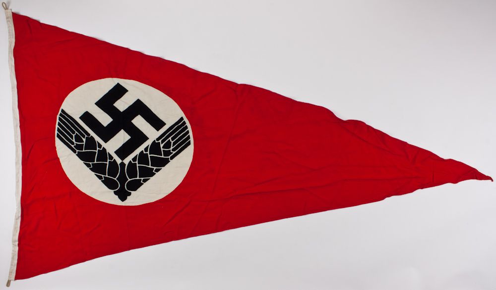 Pennant for the Reichsarbeitsdienst der weiblichen Jungend (State Labor Service for Young Women), a large double sided pennant, a high quality fine cotton/rayon body, 1.25 x 2.38 m. (4.1 x 7.8 feet), printed mirror images on either side, heavy doubled-over canvas hoist with rope loops, reinforced zig-zag stitched tail. No faults, strong colors, virtually mint condition. Much rarer than the regular RAD pennant,