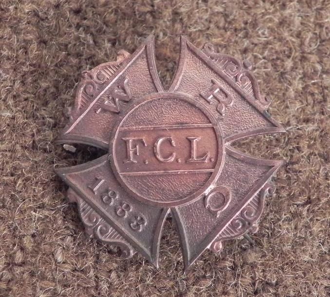 WOMEN'S RELIEF CORPS-1883-FCL MEMBERS BADGE-REVERSE "PAT AUG 20, 1889-PINBACK * * PIN & CLASP BACK-BRASS *