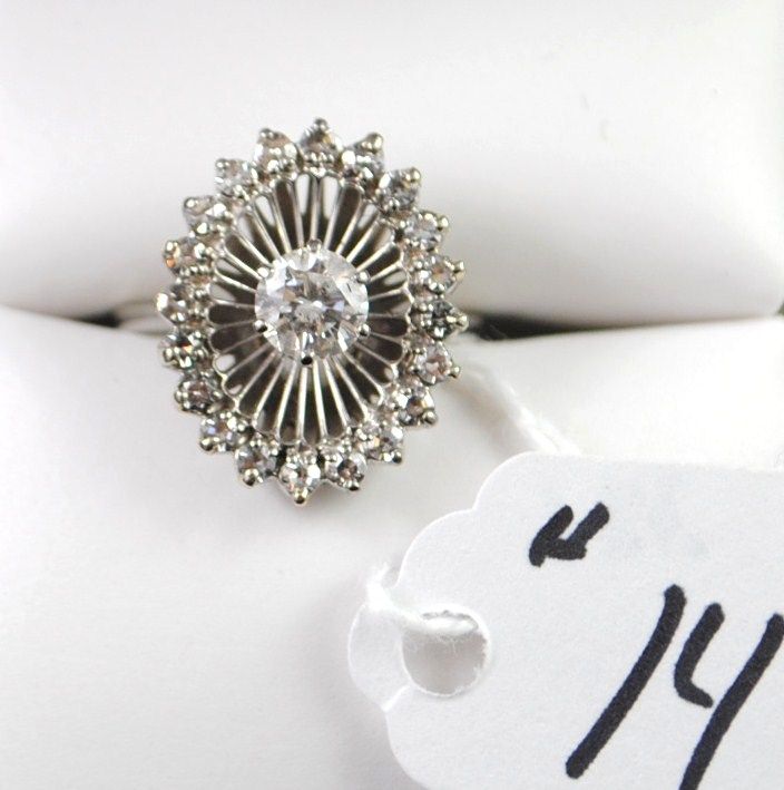 WOMENS 14K WHITE GOLD DIAMOND RING WITH ONE APPRROX. .50CT SI/I DIAMOND SOLITAIRE CENTER AND SURROUNDED WITH TWENTY SINGLE CUT DIAMONDS - WEIGHS 4.7 GRAMS - APPRAISED RETAIL REPLACEMENT IS $4,500.00