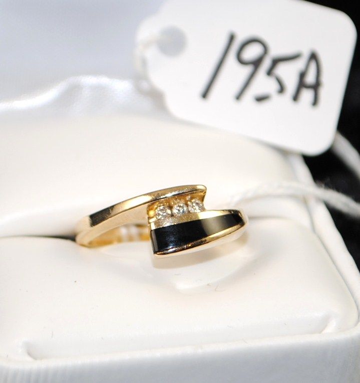 WOMENS 14K YELLOW GOLD DIAMOND AND ONYX RING WITH THREE ROUND FULL CUT DIAMONDS AND CHANNEL SET BL