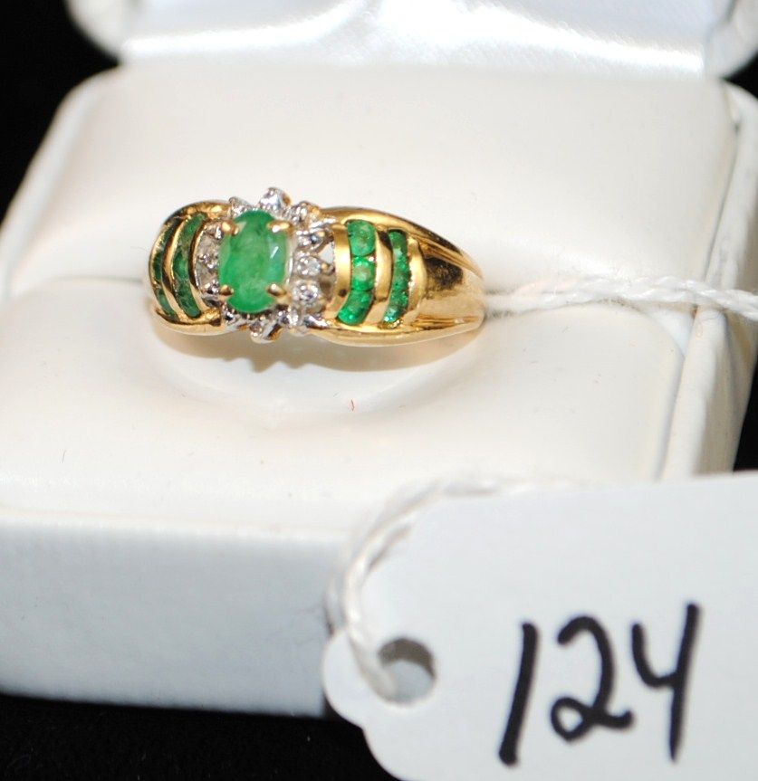 WOMENS 14K YELLOW GOLD EMERALD AND DIAMOND RING WITH ONE MARQUISE CUT CENTER GEMSTONE - TWELVE ROUND CHANNEL SET EMERALS AND FOUR ACCENT DIAMONDS - WEIGHS 4.0 GRAMS - APPRAISED RETAIL REPLACEMENT IS $1,975.00 - COMES WITH THE JEWELERS APPRAISAL CARD FOR INSURANCE