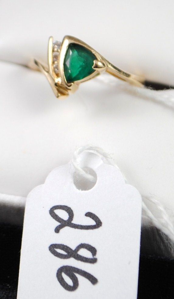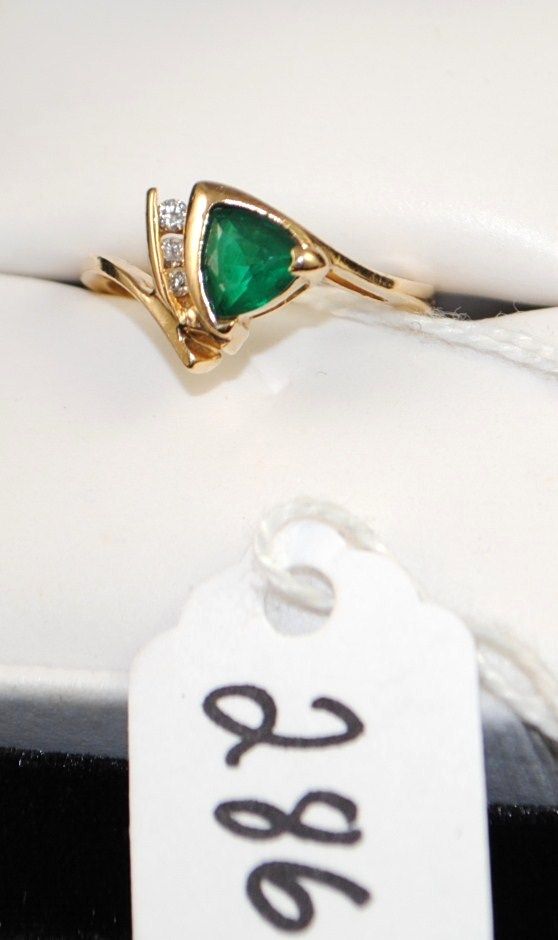 WOMENS 14K YELLOW GOLD LAB CREATED EMERALD AND DIAMOND RING WITH ONE TRI-CUT LAB CREATED EMERALD AND THREE ACCENT DIAMONDS - WEIGHS 2.8 GRAMS - APPRAISED RETAIL REPLACEMENT IS $900.00 - COMES WITH THE JEWELERS APPRAISAL