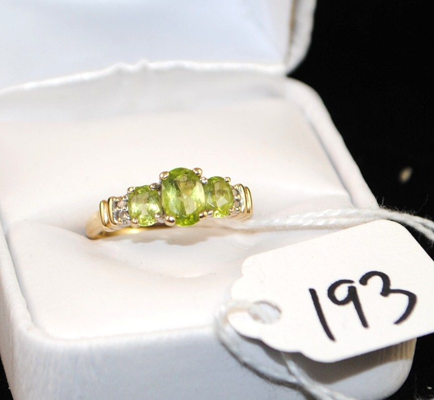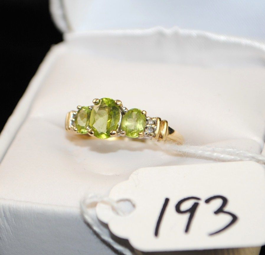 WOMENS PERIDOT AND DIAMOND RING WITH THREE PERIDOT AND FOUR DIAMONDS - SET IN 10K YELLOW GOLD RING - WEIGHS 2.7 GRAMS - APPRAISED RETAIIL REPLACEMENT IS $885.00. - COMES WITH THE JEWELERS APPRAISAL CARD FOR INSURANCE